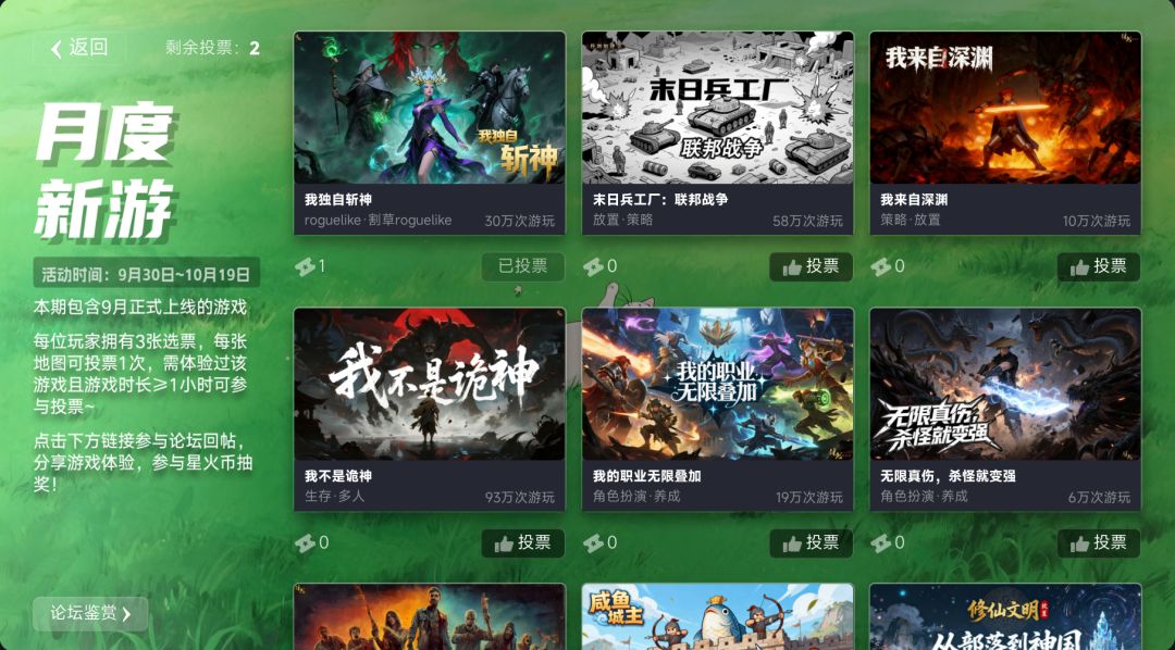 每位玩家拥有3张选票,大家可投票支持喜欢的游戏!
