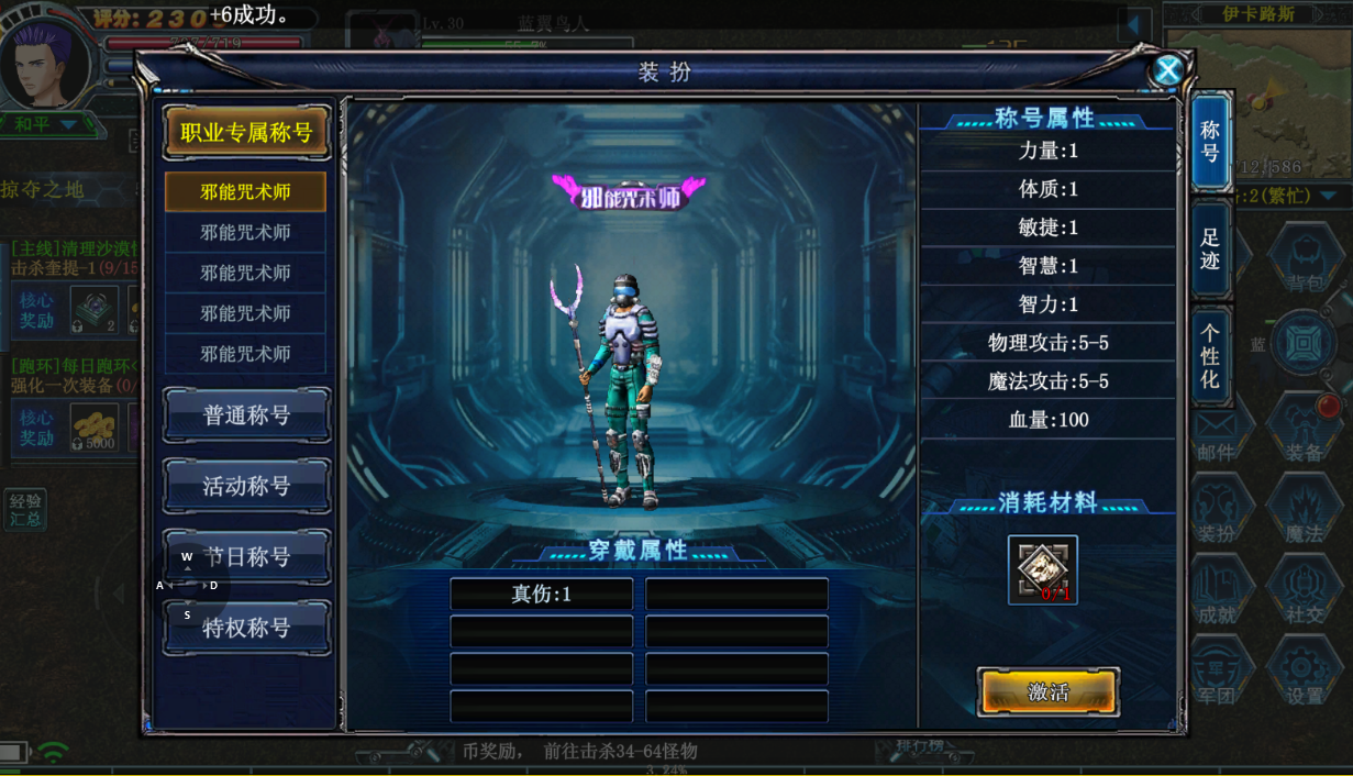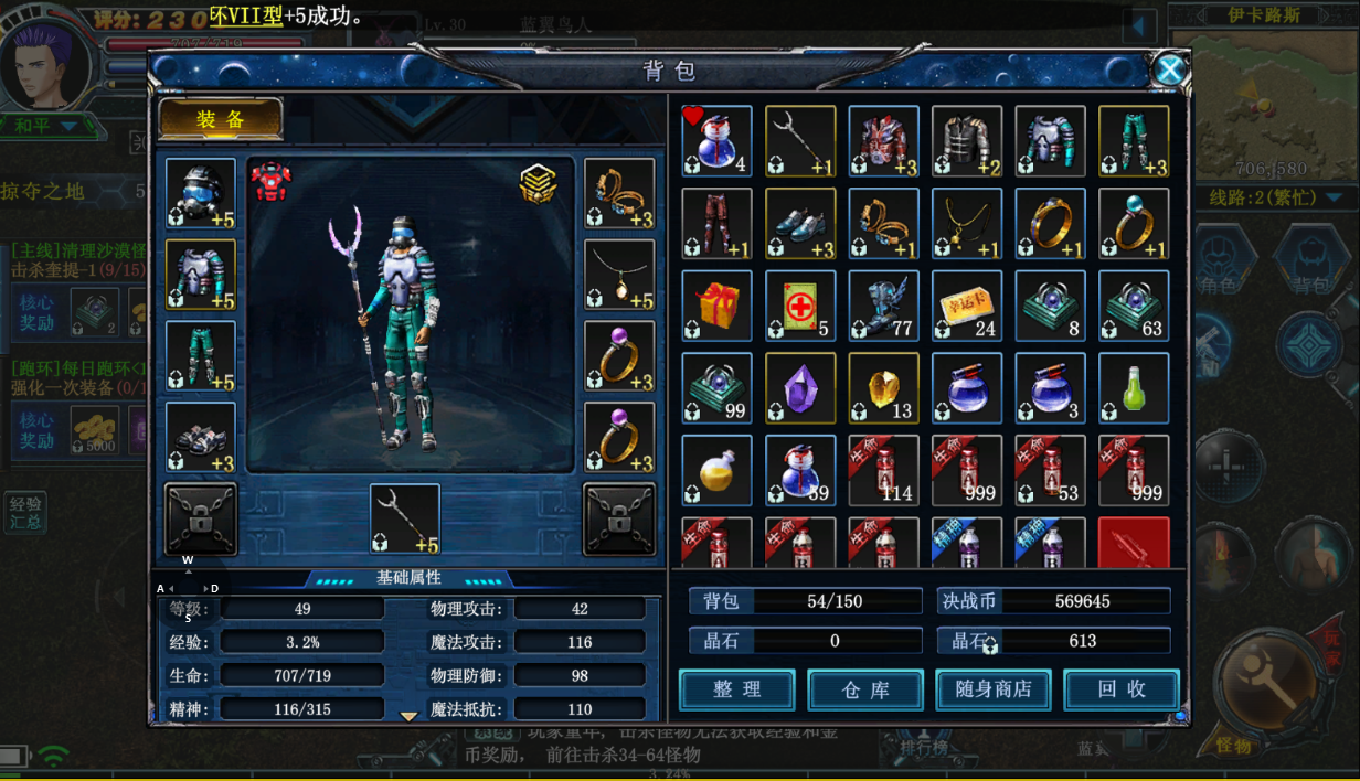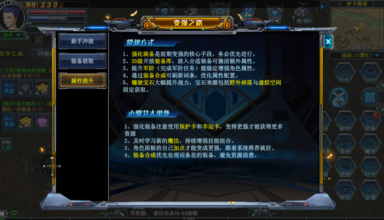 首先刚进入游戏,跟着左边的主线任务走即可快速升级,同时也能够获得这个全套的基础装备,前期把这个全身装备加4即可激活共敏属性,或者说后面打怪扛不住伤害,咱们也可以把这个装备啊强化到加6也是非常简单的,这样前期做一些这个基本任务都是没有问题的。