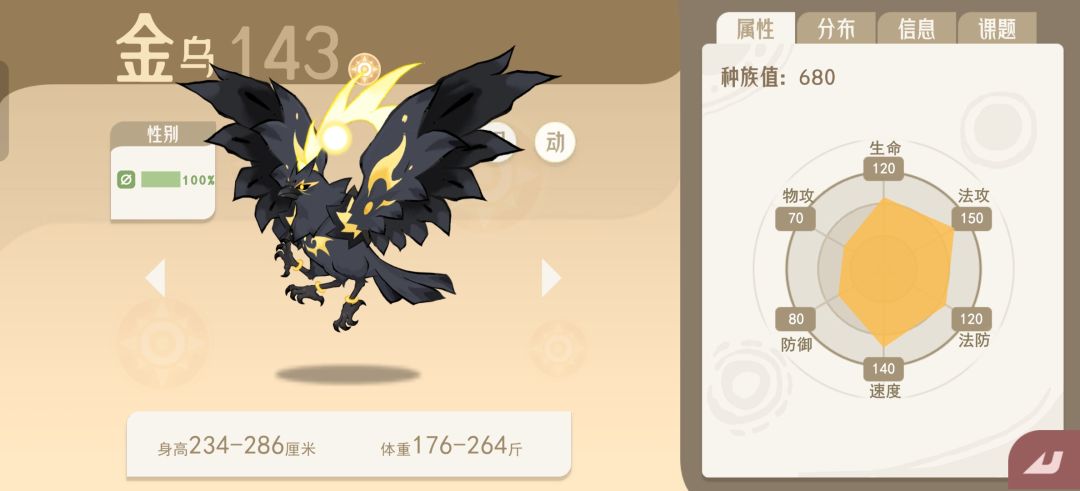小黑龙简评:金乌的种族值相当优秀,140的速度种族值目前所有宠物最高,还搭配150的法攻。可是特性【晴天】目前能联动的宠物太少,具体强度还要看看技能池。