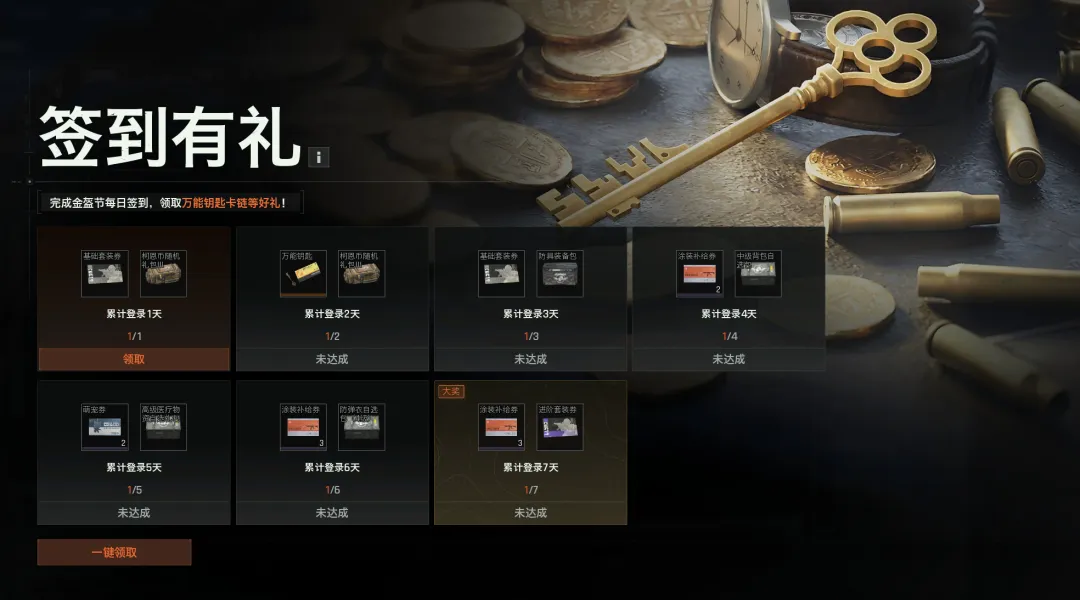 活动期间,每日登录完成签到,即可领取万能钥匙卡链,装备补给包、柯恩币等丰厚奖励!