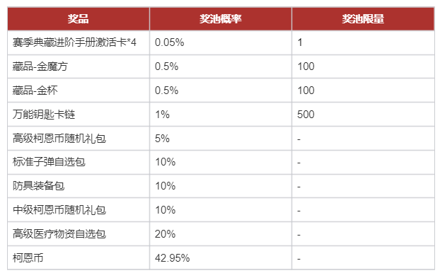 活动期间,新注册的先锋达到6级和30级时可分别获得1次Q币抽奖机会,最高可得999Q币,数量有限先到先得!活跃先锋每日完成任意模式对局1次,即可获得1次抽奖机会,可抽取万能钥匙卡链、柯恩币礼包、物资包等丰厚好礼!