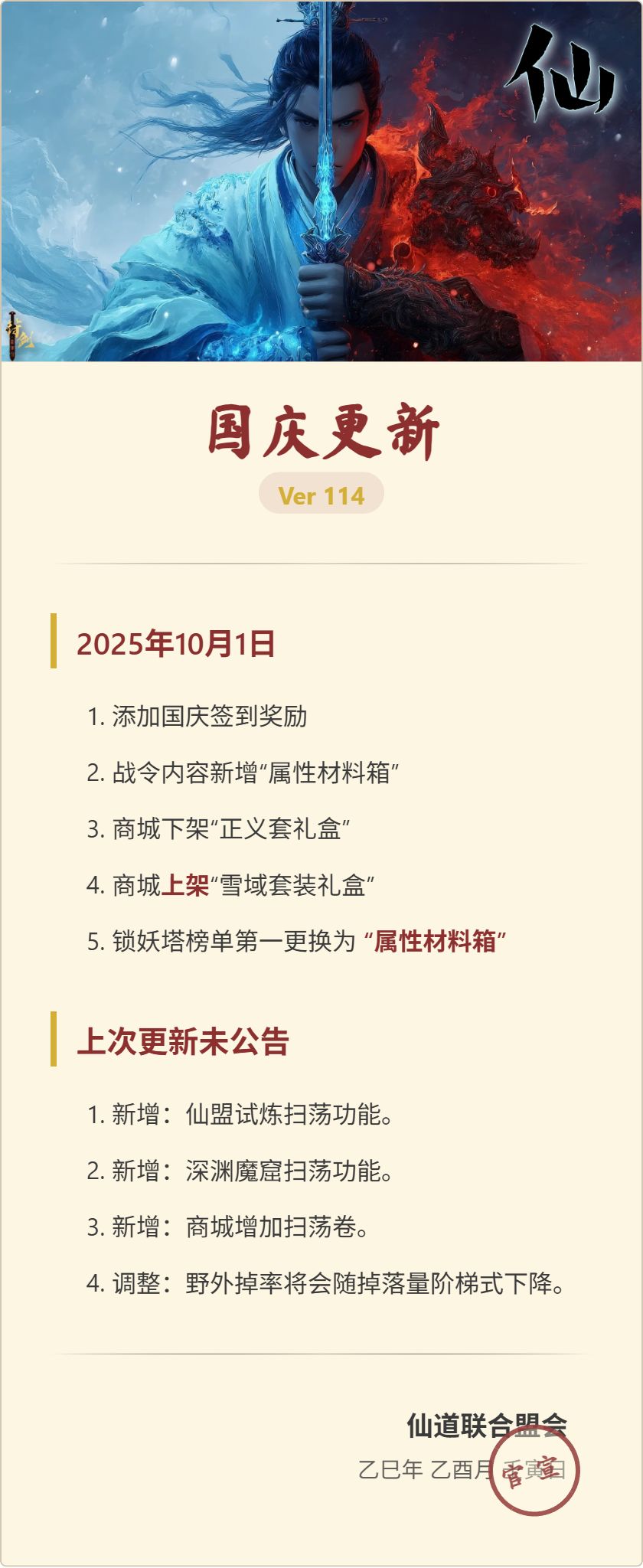 仙 更新公告