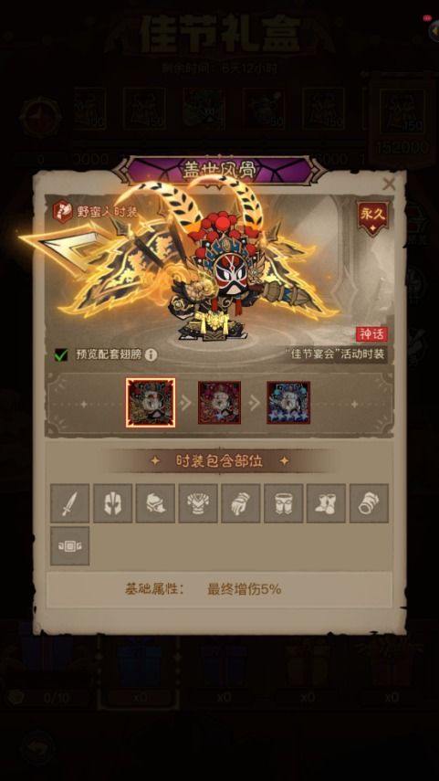 4、累积足够的佳节积分可以领取进度奖励,奖励包括时装「野蛮人-盖世风骨」/「秘法师-雅韵芳菲」、翅膀「盖世旌旗」/「芳菲绫缎」、神话遗物等珍稀道具。