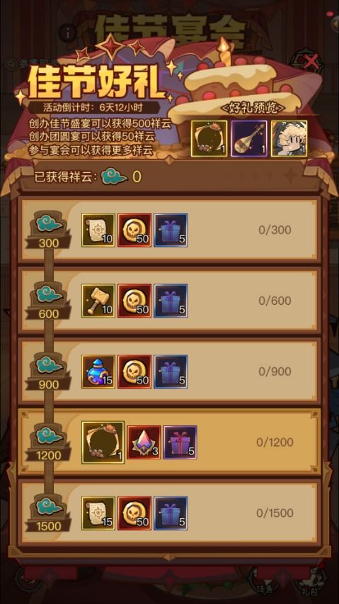 1、创办、参与盛宴过程中可以获得祥云道具,累计祥云道具后可以领取丰厚的奖励。