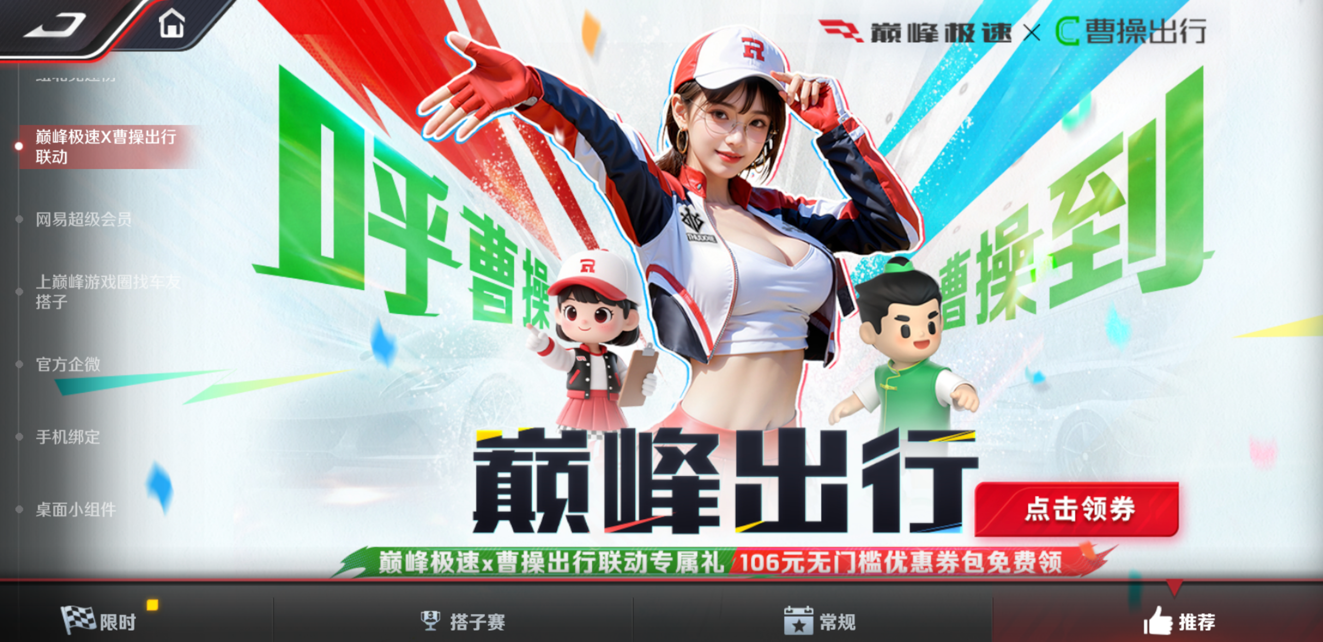 《巅峰极速》× 曹操出行联动火热进行中!现在登录游戏前往活动-推荐页面,点击领券即可领取到账!