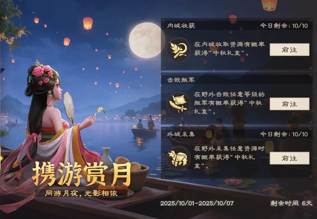 1、完成日常任务叛军,采集,收集资源可获得中秋礼盒道具;