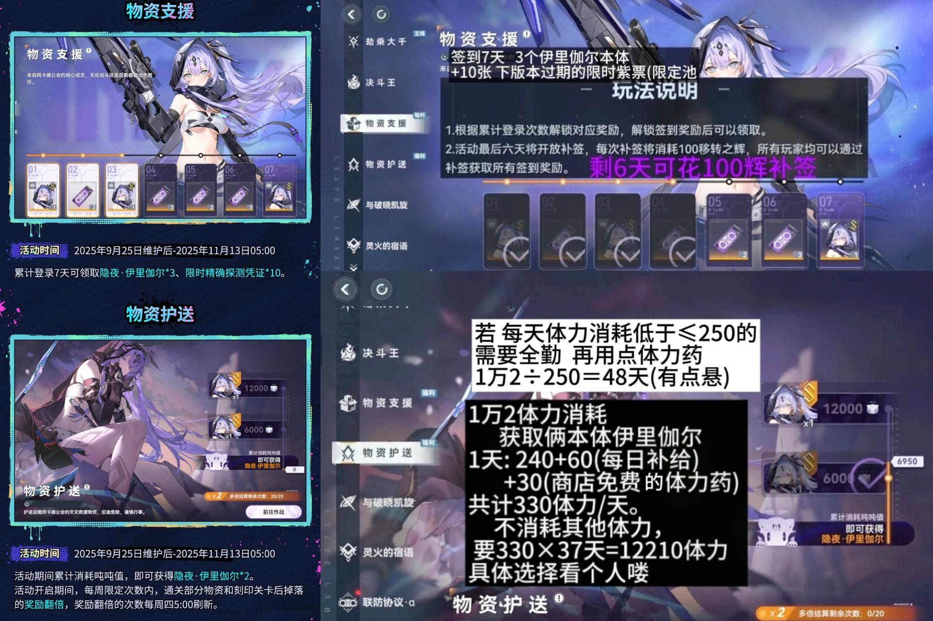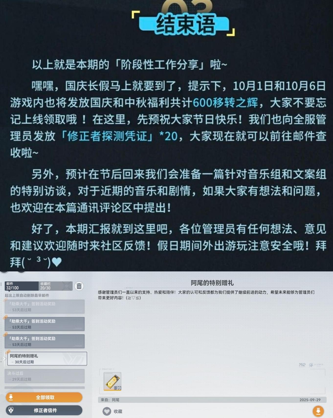 每周年累登的时迹回赠。涉及累登签到和恒定观测+对策协议相关。全勤320天会有一张自选卡(25年9月1号之前角色,不包括联动),皮肤换装券等
