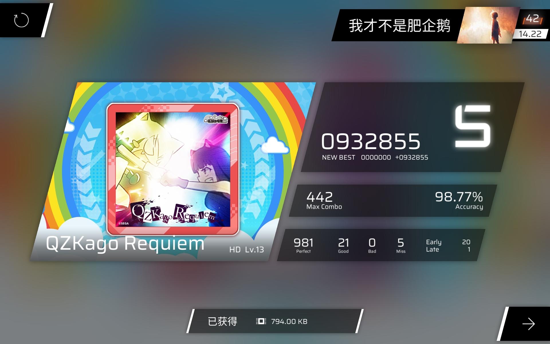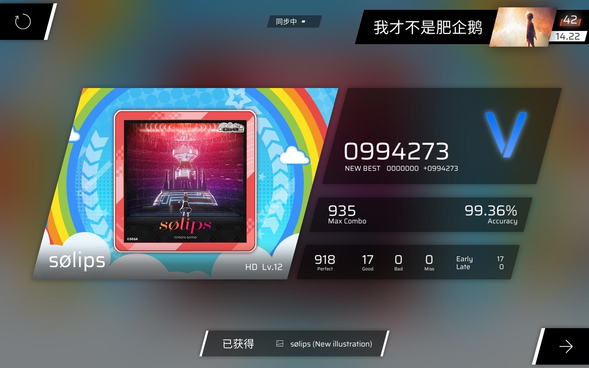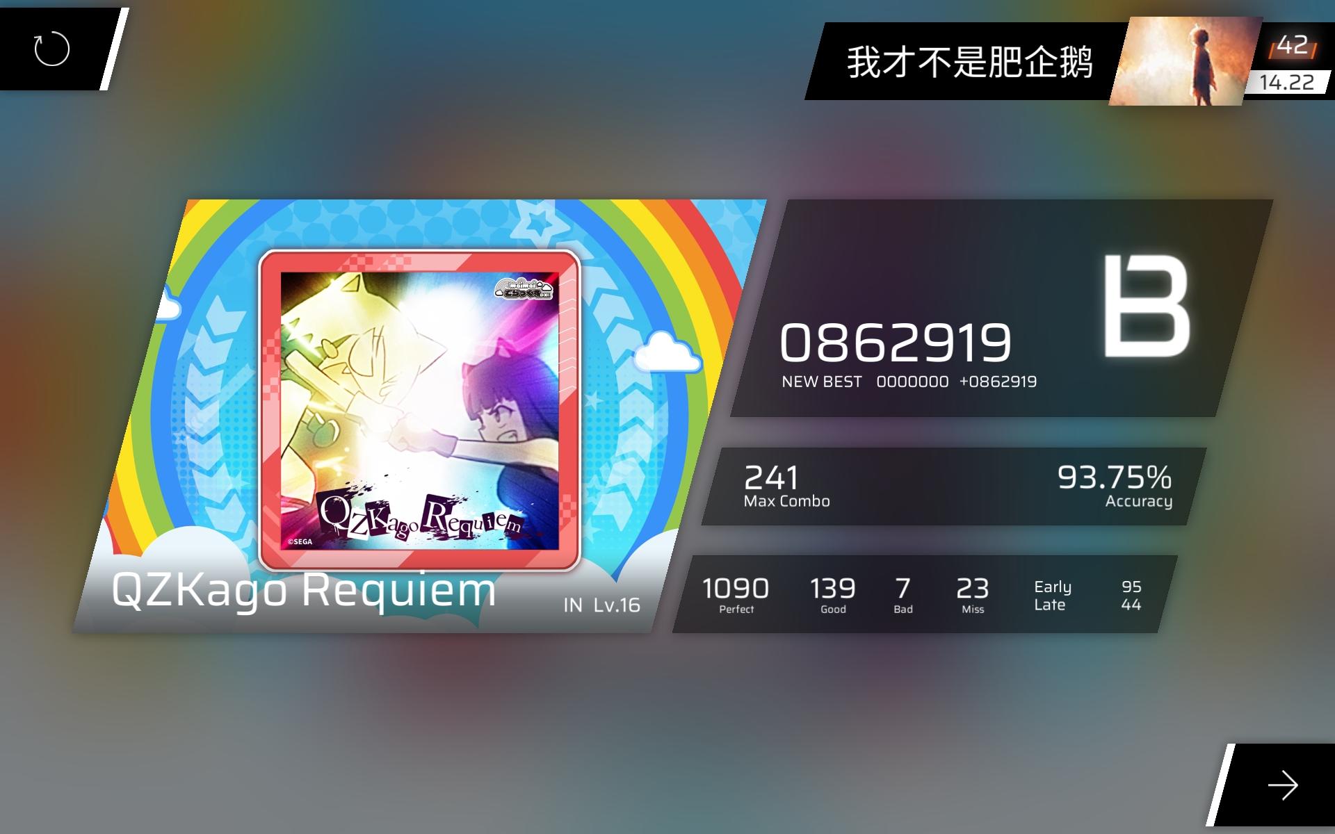 第一首全是日文的曲名曲子听起来相当不错,不过脑裂还是需要多打几次才适应。这里放的是三见的成绩,稍微能读懂一点谱的程度。谱面还是不错的,男女轮唱的时候,黄键引导长条位移,蓝键单指扛,这段谱面比较喜欢。另外还有几个红键夹带四个黄键,这个地方的打击特效喜欢。