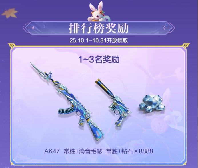 而且大神挑战还同步开启了超燃的大神排行榜,上榜就有奖励,越靠前福利越丰厚——前三名能拿到AK47-常胜、消音毛瑟-常胜和8888钻石。