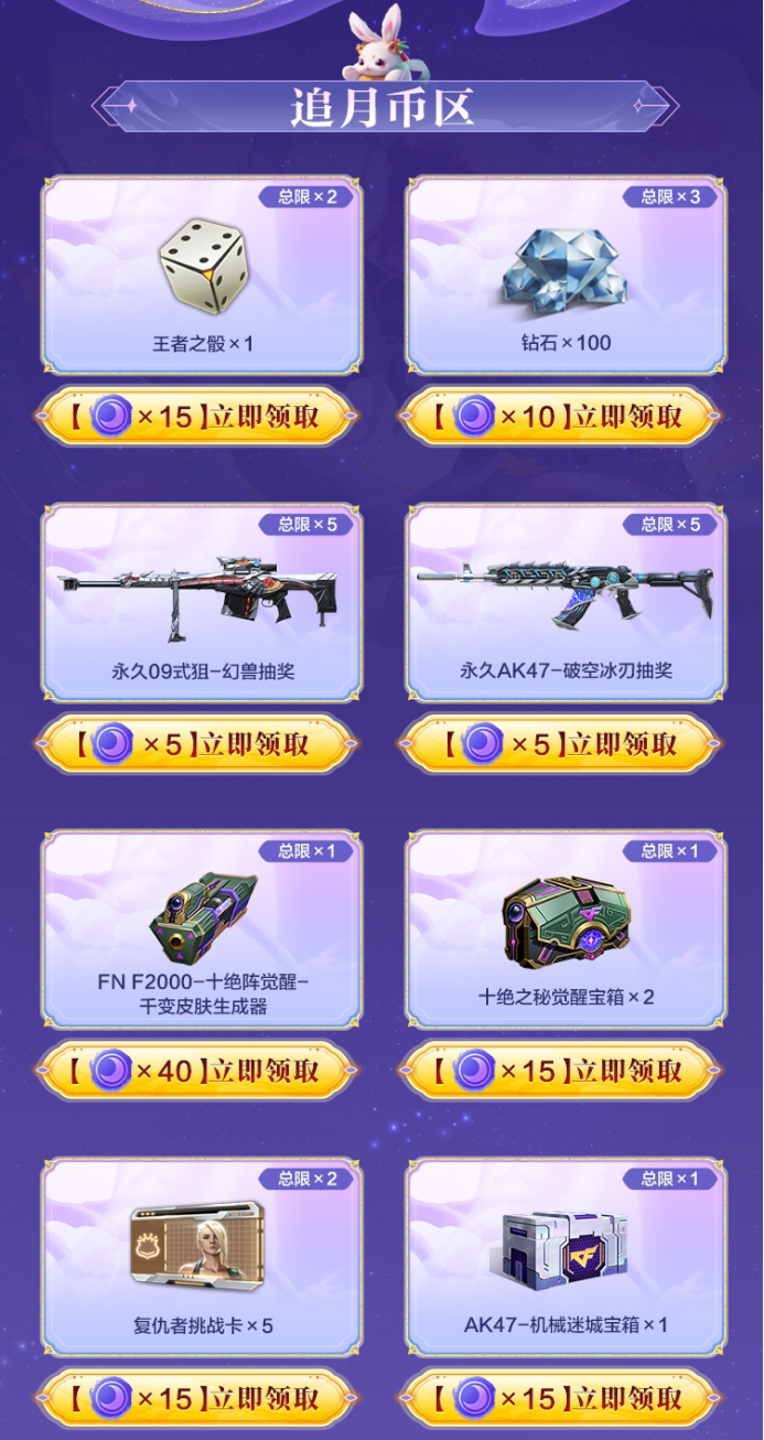 追月币区同样诚意满满,不仅能拿到王者之骰和钻石,还有永久武器可以抽,09式狙-幻兽、AK47-破空冰刃,错过可就没这么好的机会了。除此之外,FNF2000-十绝阵觉醒千变皮肤生成器、十绝之秘觉醒宝箱、AK47-机械迷城宝箱也在这儿等你开启,想觉醒武器、解锁专属皮肤的CFer可别错过,最后别忘了换复仇者挑战卡,多一张卡就多一次拿永久角色的可能。