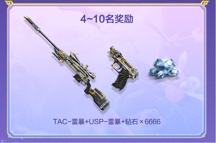 4到10名有TAC-雷暴、USP-雷暴和6666钻石。11到50名可领QBZ03-枪娘、分裂雷和3888钻石。51到100名能获得尼泊尔-火麒麟、烟雾弹-天使和6666钻石。就连101到500名,也有【皮肤】M4A1-死神-秘银和6666钻石,不管排名如何,都能满载而归。