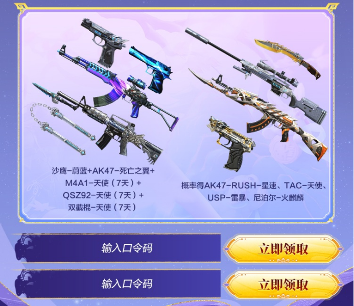 更值得一提的是,追月宝库还开放了专属码复制功能,这可是额外的助力福利!只要输入KOL或其他玩家分享的口令码,再登录一次游戏,沙鹰-蔚蓝、AK47-死亡之翼、M4A1-天使(7天)、QSZ92-天使(7天)、双截棍-天使(7天)这些豪华道具就能轻松进背包,运气好的话,还能开出AK47-Rush-星速、TAC-天使、USP-雷暴、尼泊尔-火麒麟,赶紧把你的专属码分享给好友,让大家一起领福利。