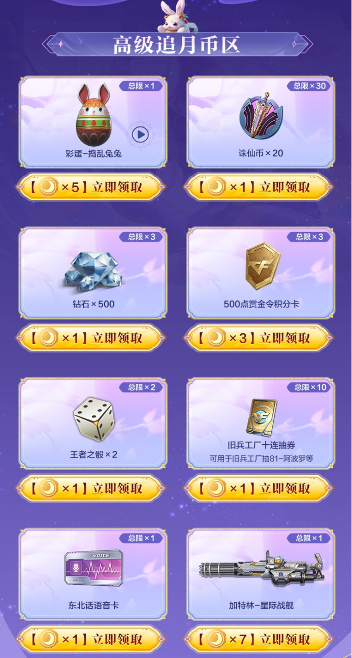 高级追月币区的福利也不逊色,不仅有诛仙币、钻石、赏金令积分卡、王者之骰,还有旧兵工厂十连抽券、东北语音卡、加特林-星际战舰,更贴心的是,这里还藏着中秋专属彩蛋——捣乱兔兔,兑换之后就能沉浸式感受中秋氛围,仪式感直接拉满。