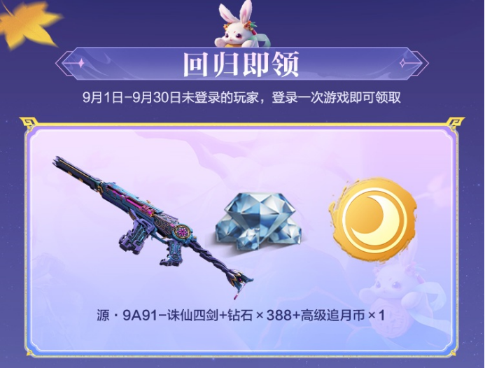 如果是9月1日到9月30日没登录过游戏的回归CFer,那这波专属福利可千万不能错过!只要回归后登录一次游戏,就能直接领取源·9A91-诛仙四剑、388钻石和1枚高级追月币。