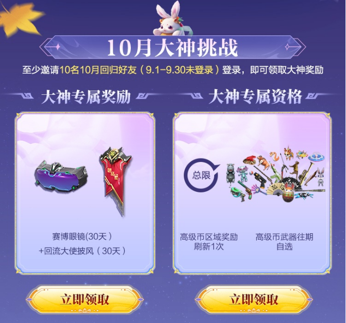 喜欢挑战的CFer,千万别错过10月大神挑战!只要成功邀请至少10名9月整月没登录的回归好友重返战场,就能解锁两大专属福利:一是赛博朋克风的赛博眼镜(30天)和回流大使披风(30天),戴上就能成为战场最靓的仔。二是大神特权,不仅能去高级追月币区刷新一次奖励,还能自选往期高级追月币武器,想要什么道具自己说了算。