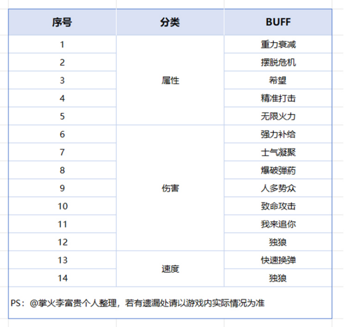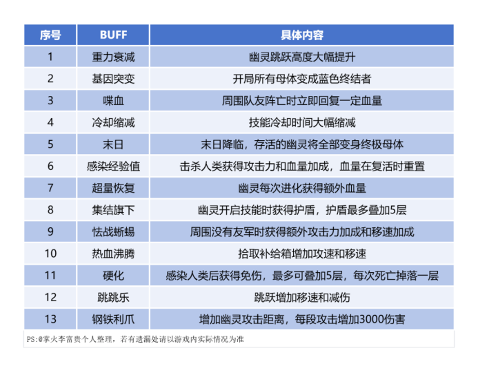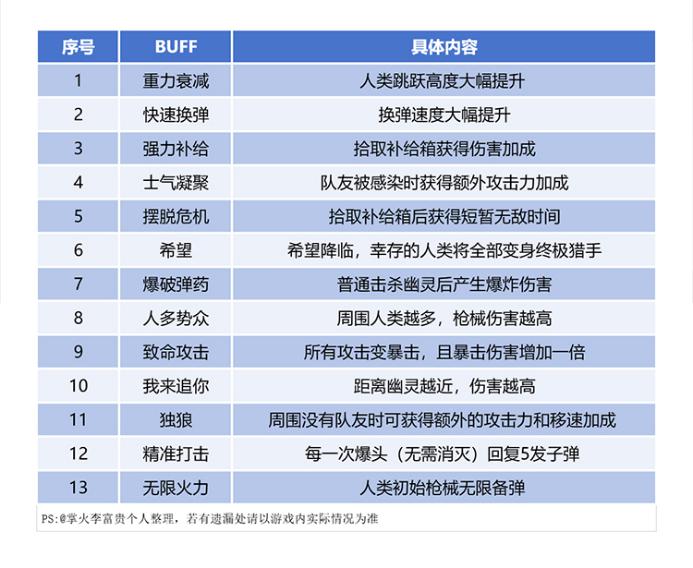 同时为了方便大家阅读,本文分为【人类阵营局内BUFF解读】、【幽灵阵营局内BUFF解读】及各自的【实战神仙搭配解析】版块,大家也可以自行跳转至自己感兴趣的部分查看。【人类阵营局内BUFF解读】本次更新后,不仅上线了双BUFF模式,而且返场了一些老BUFF,玩法更加丰富有趣,这里我也将目前对局里常见的部分BUFF给大家整理成表格,供大家参考一下: