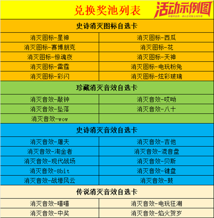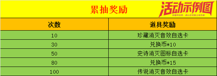 “万化市集”累计抽奖环节共可获得“珍藏音效消灭自选卡、史诗音效消灭自选卡、传说音效消灭自选卡,以及活动兑换币*25”。
