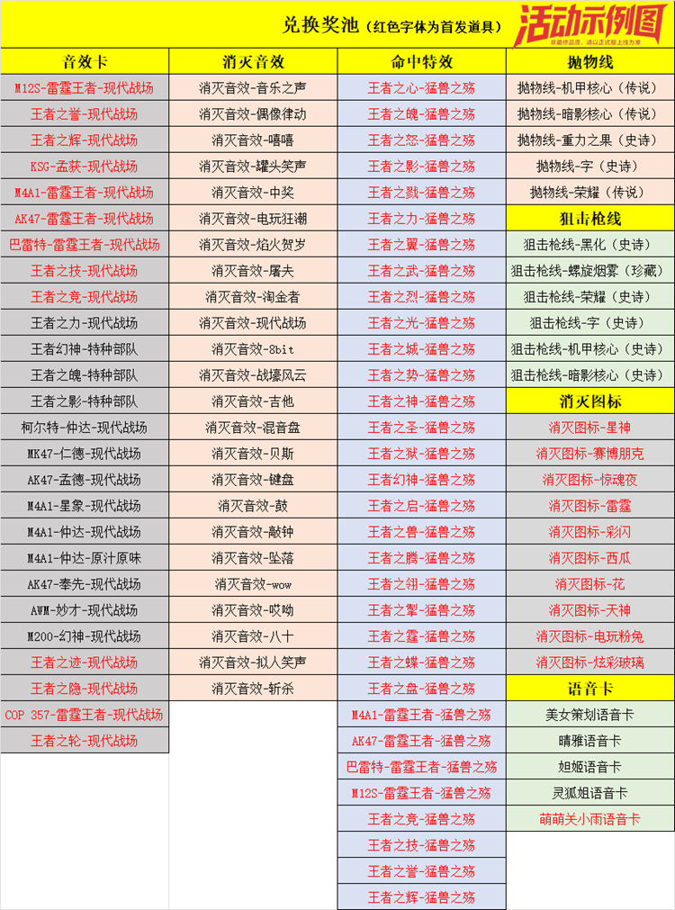 兑换奖池可分为音效卡、消灭音效、命中特效、抛物线、狙击枪线、消灭图标、语音卡这7大类,其中命中特效与消灭图标这两大类可兑换的奖励都是首发哦!音效卡:音效卡中有顶尖的狙击枪王者幻神的特种部队音效卡,更有“王者之力-现代战场、MK47-仁德-现代战场、M4A1-星象-现代战场、AK47-奉先-现代战场、AWM-妙才-现代战场、M200-幻神-现代战场”等热门武器的音效卡!