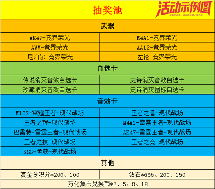 在“万化市集”的抽奖道具中,可抽取“AK47-竞界荣光、M4A1-竞界荣光、AWM-竞界荣光、尼泊尔-竞界荣光、AA12-竞界荣光、左轮-竞界荣光”这几款非常经典的武器。