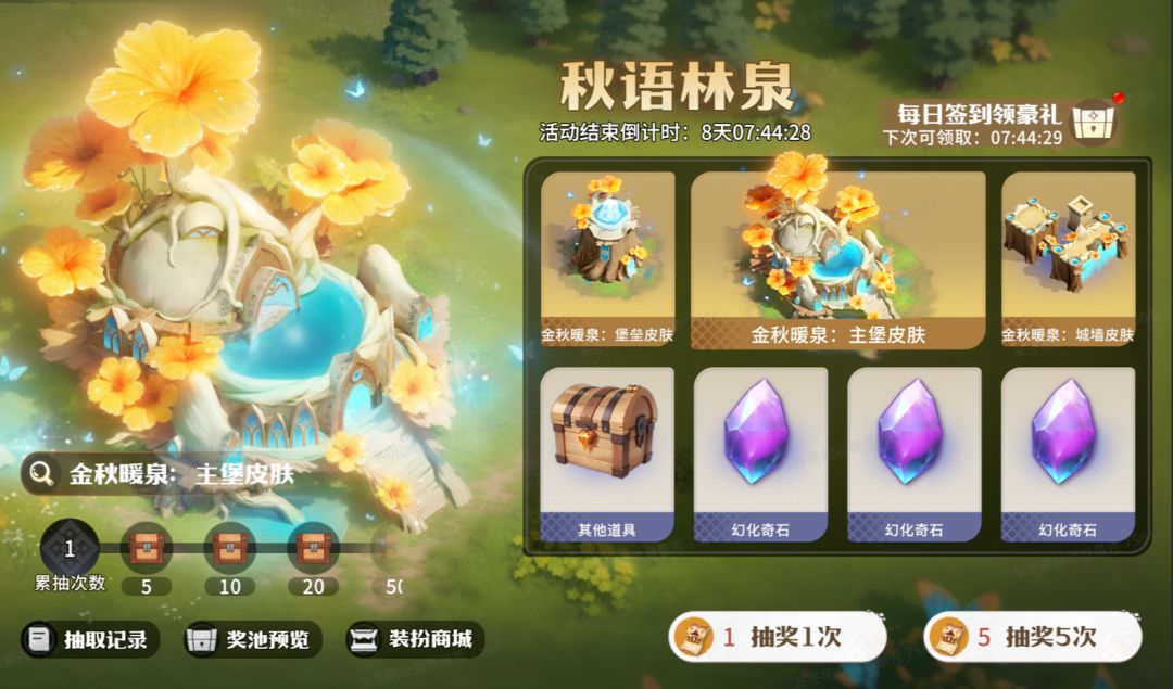 活动期间,可通过购买主城装扮券参与抽奖,有机会获得金秋暖泉主堡皮肤等珍稀装扮;通过抽奖或重复装扮道具转换还可获得幻化奇石,用于在装扮商城中兑换更多装扮道具。活动期间,参与活动签到赠礼累计7天可领取主城装扮券*10。