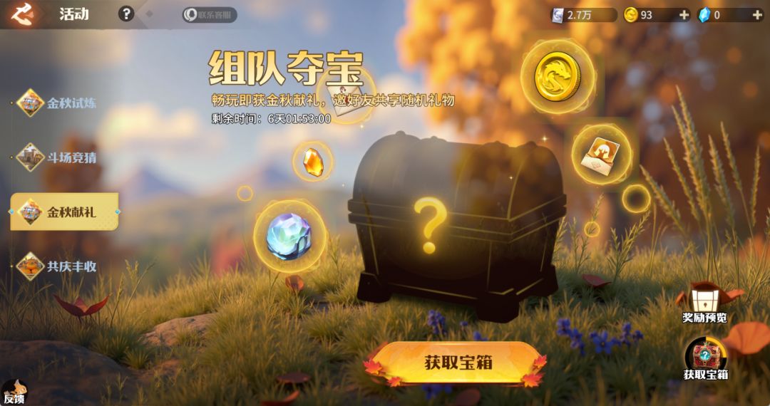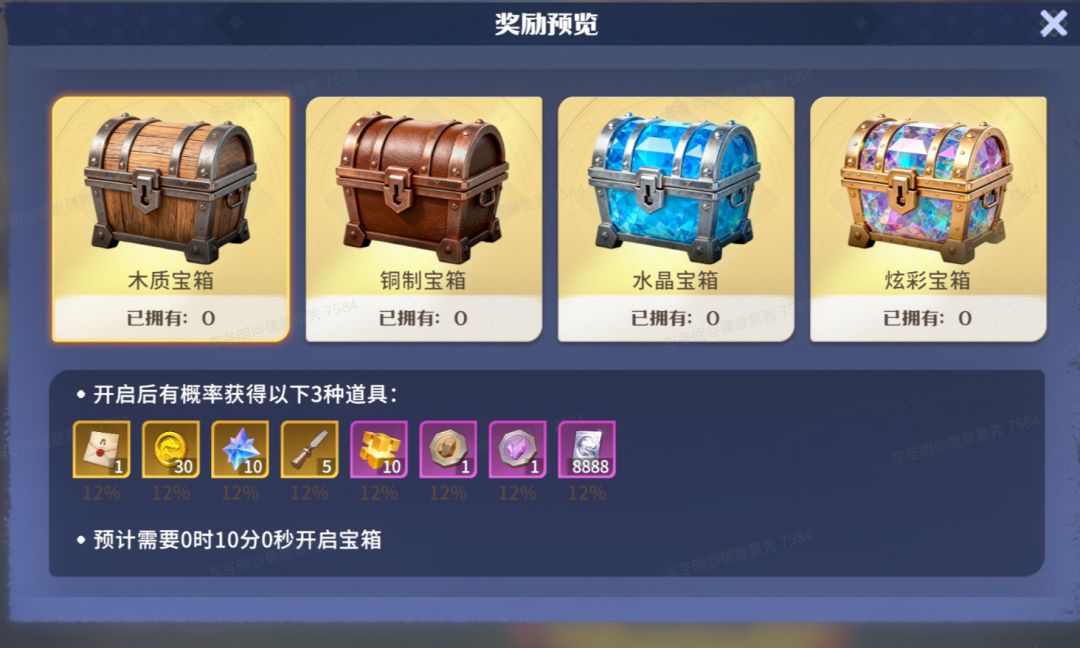 活动期间每天完成任务可获得一个随机品质的宝箱(木质、铜质、水晶、炫彩),并可以进一步定制提升该宝箱的品质。每个宝箱开启需要等待一定时间,邀请好友组队进行宝箱开启则可缩短等待时长,同时玩家自己和好友均可获得宝箱内奖励。根据宝箱品质,开启后可获得英雄邀请函、龙币、秘焰晶核等不同价值的稀有道具。