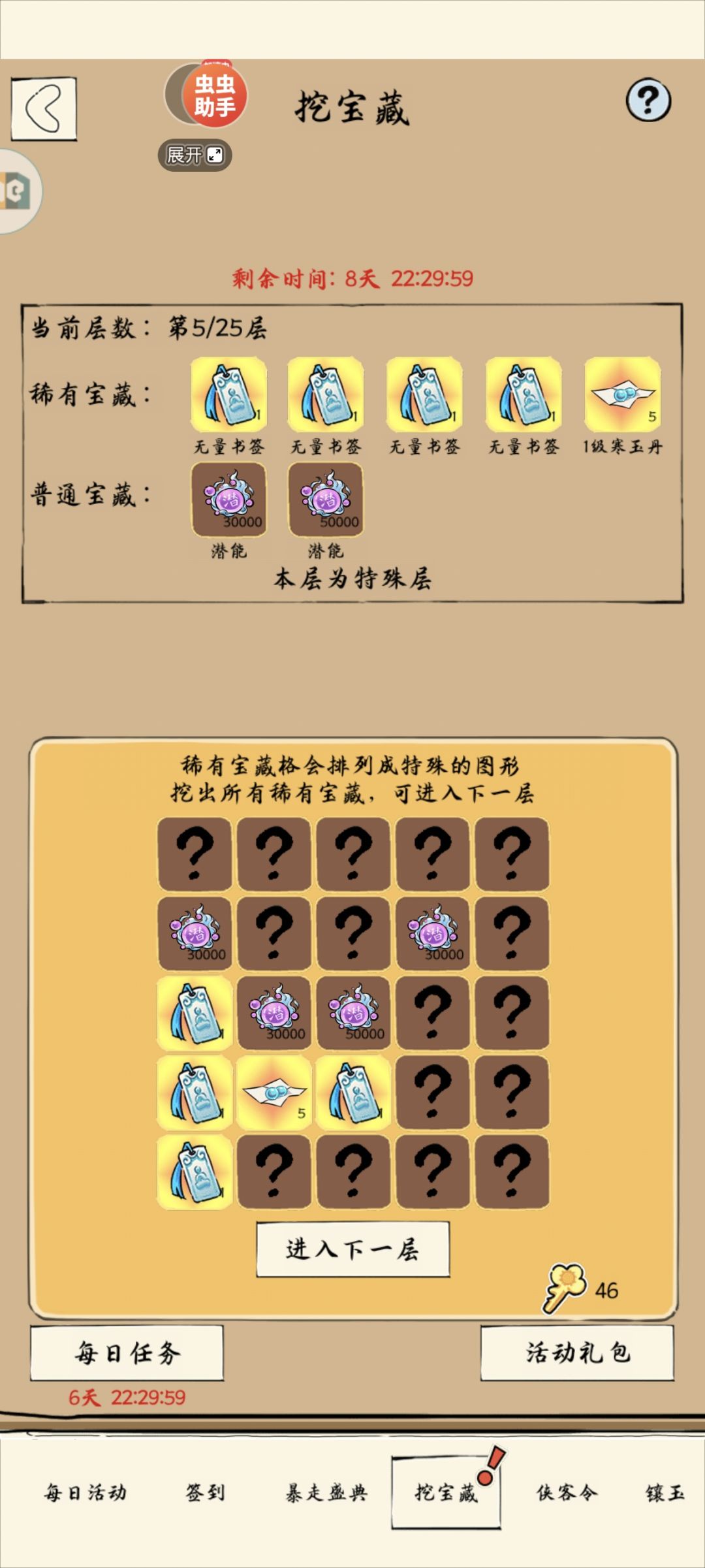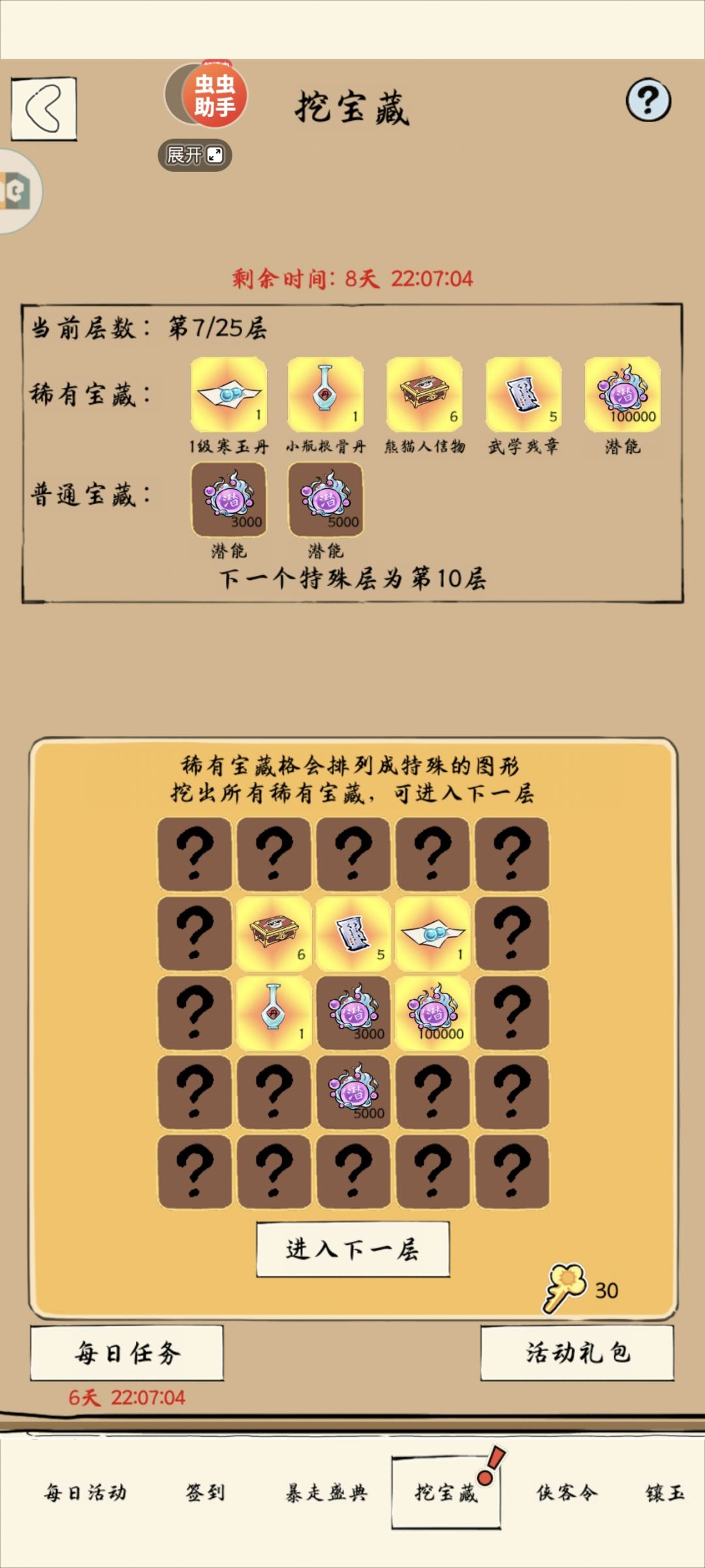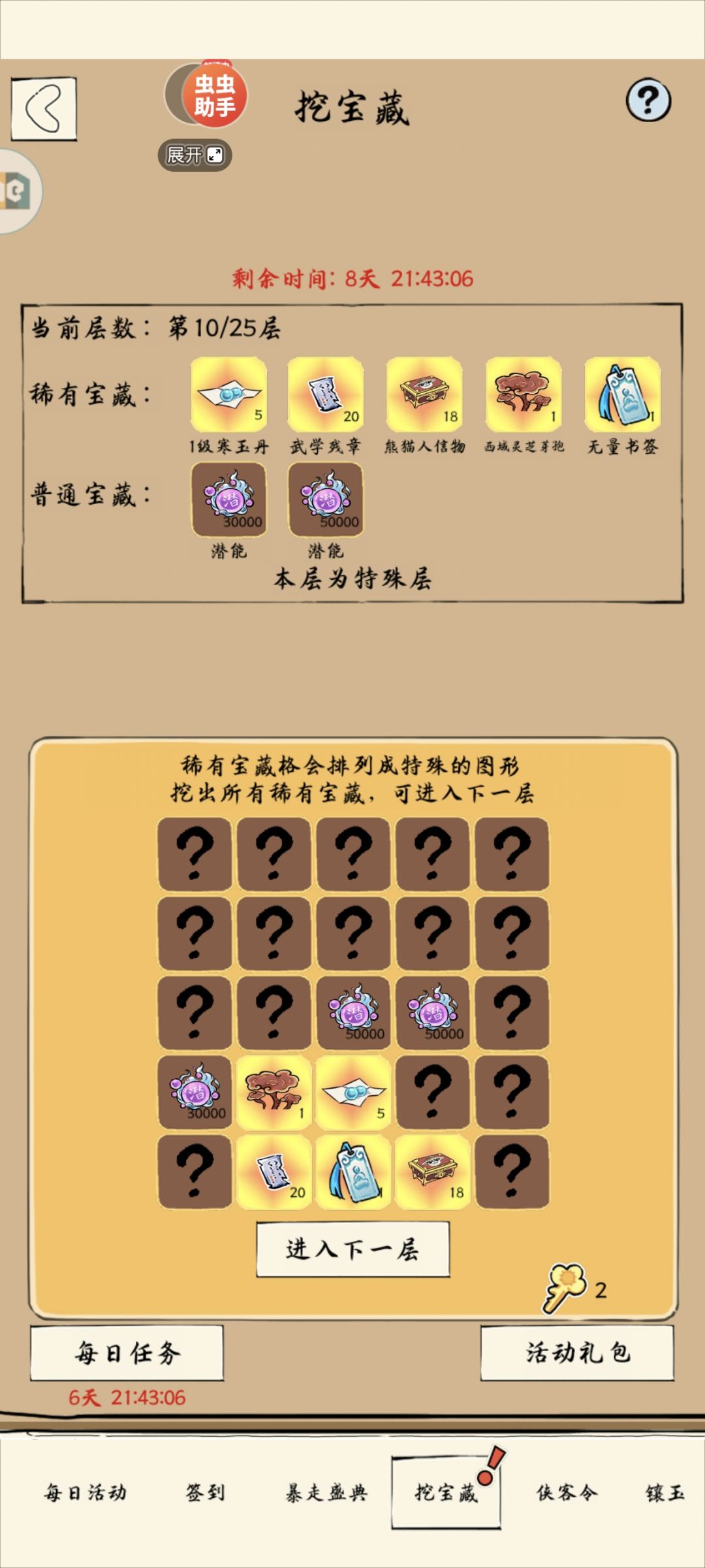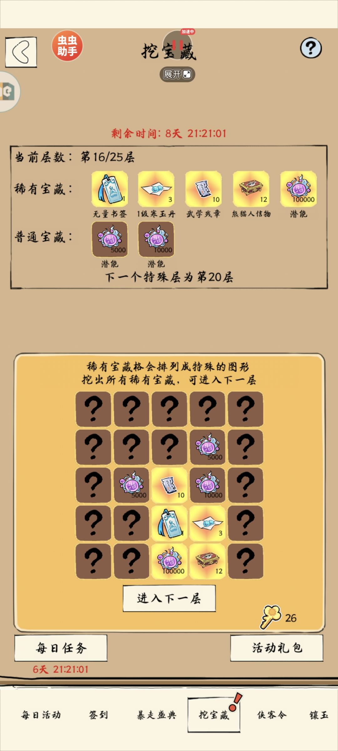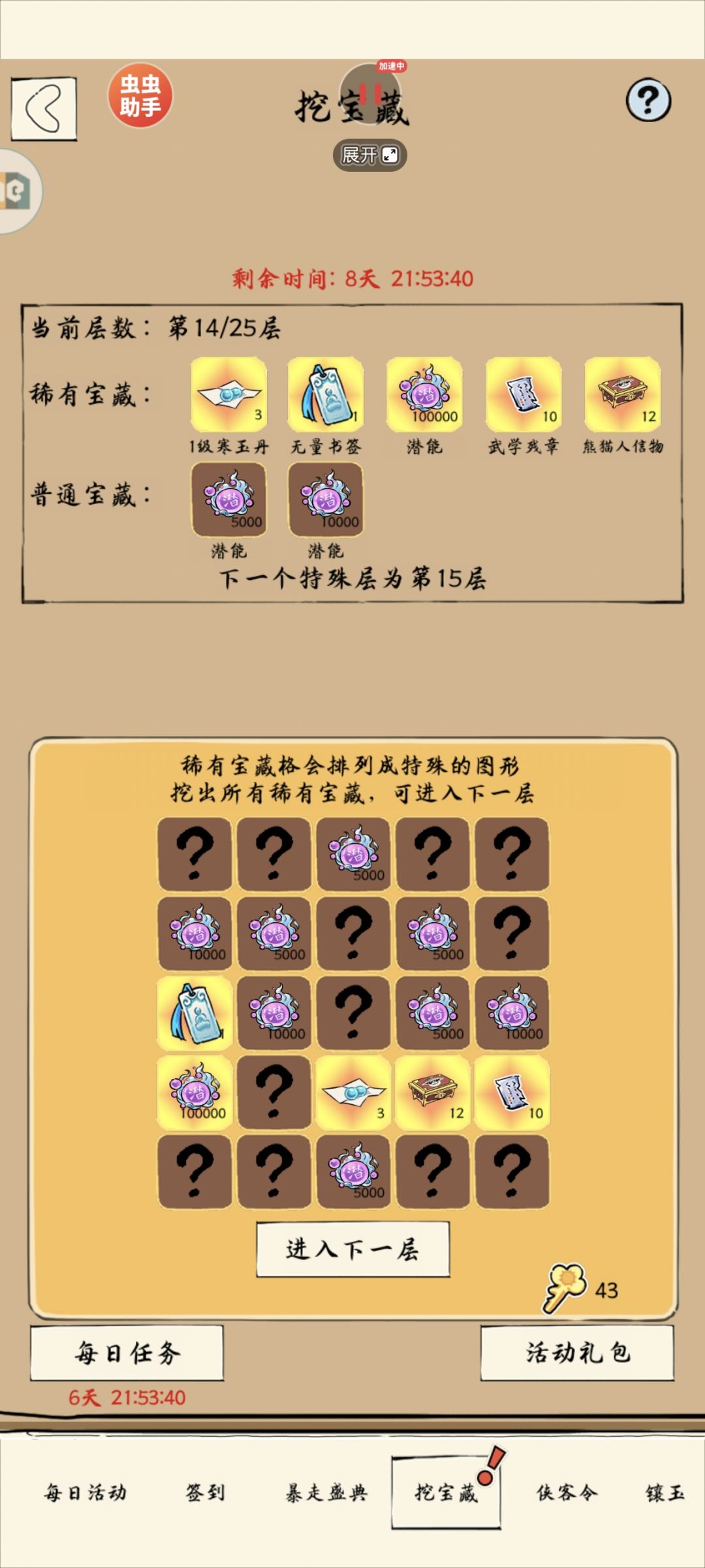 事情是这样的,某个萌新想要一套活动衣服,结果氪玩前面的小礼包(200金条 108元宝 680元宝 1880元宝)才发现,到25层5还差20个左右,结果又去买了328一档,等我走到十五层天塌了,衣服就在十五层!xf说调整了挖宝,我以为就把宝箱换成了衣服,没想到整这一手