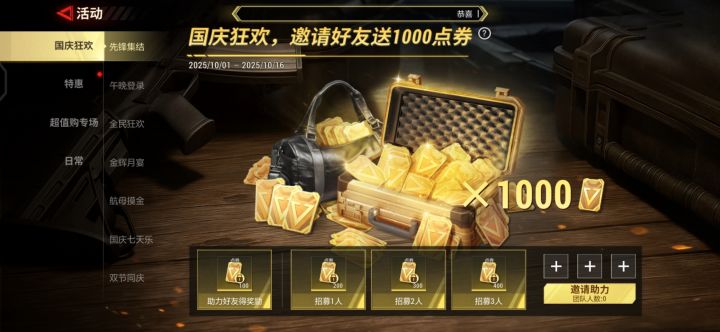 先锋集结码【aNyFOtm2zCp9H+nW】航母夺金,国庆狂欢,邀请好友得1000点券,领限定黑卡,更有免费80抽、大金宝箱和多款皮肤!