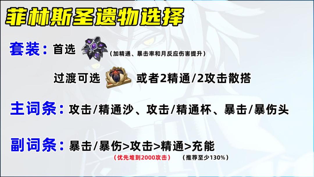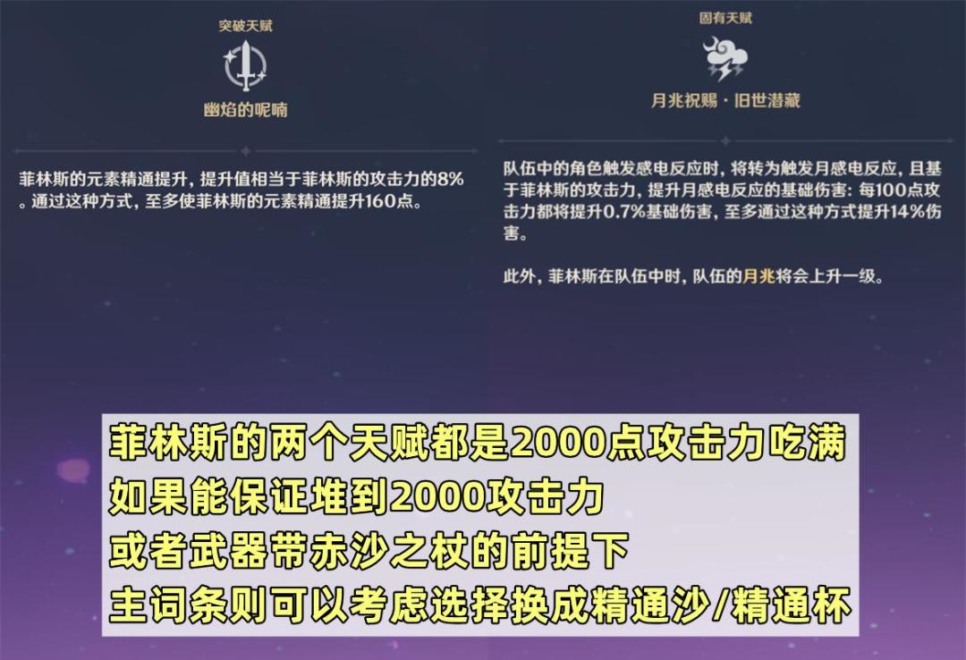 词条方面,需要注意的是菲林斯的两个天赋效果都需要堆到2000攻击力吃满。如果能保证堆到2000攻击力,或者武器带赤沙之杖的前提下,主词条则可以考虑选择换成精通沙或者精通杯。