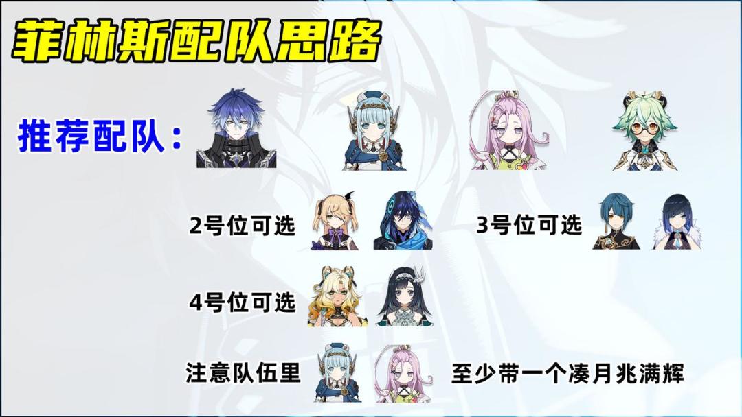 【配队思路】推荐配队为:菲林斯+伊涅芙+爱诺+砂糖。2号位还可以选择菲谢尔/欧洛伦;3号位还可以选行秋/夜兰;4号位还可以选希诺宁/蓝砚。另外需要注意的是,队伍里伊涅芙或者爱诺至少要带一个,来触发月兆满辉的效果。