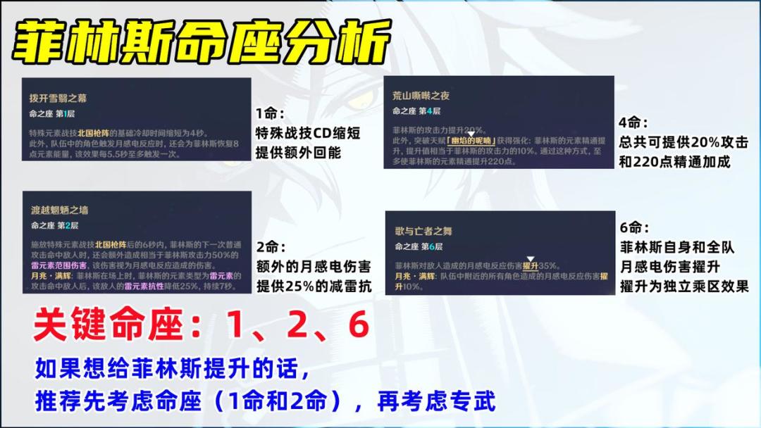 综合来看,菲林斯的关键命座是1、2、6。如果想给菲林斯提升的话,推荐先考虑命座(1命和2命),再考虑专武。以上就是菲林斯的培养攻略,希望能帮助到各位小伙伴~