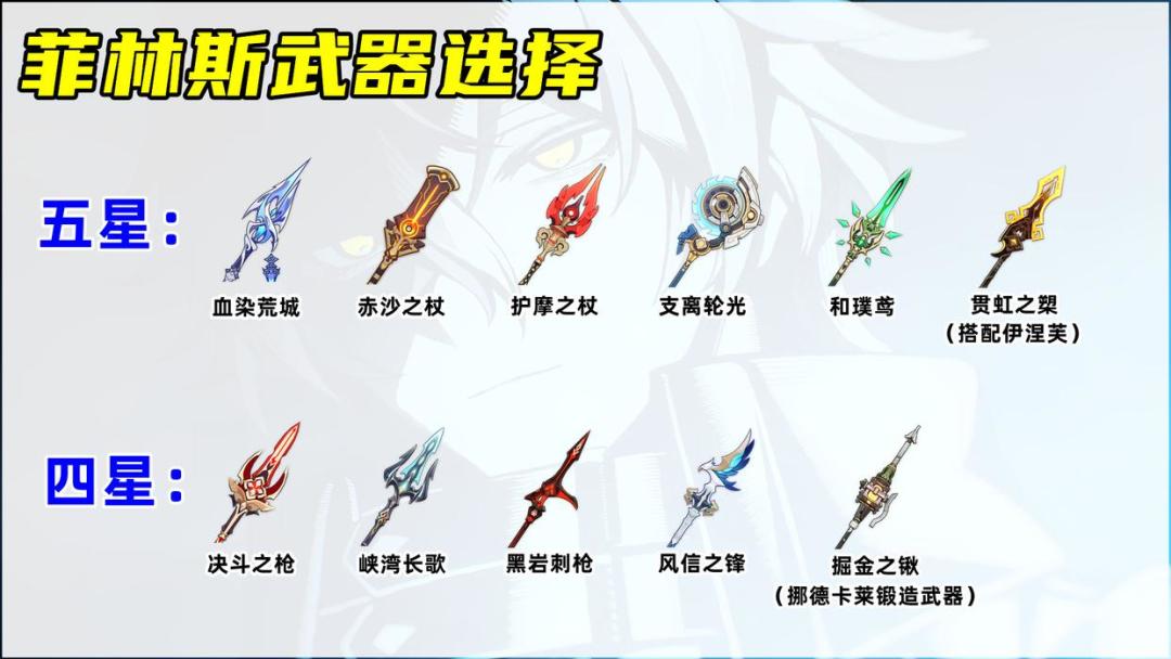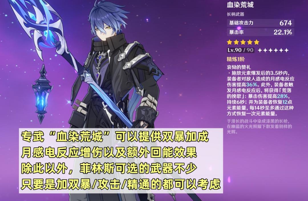 【武器选择】首选专武“血染荒城”,可以提供双暴加成、月感电反应增伤、以及回能效果。专武以外,菲林斯可选的武器很多,而且伤害表现都不错,只要是加双暴/攻击/精通的都可以考虑。