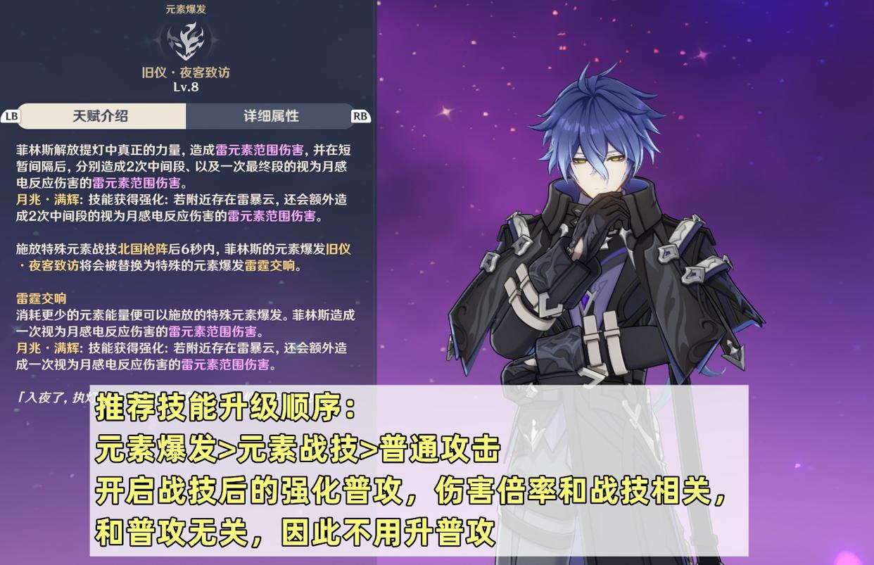 【技能简析和升级建议】推荐技能升级顺序为:元素爆发>元素战技>普通攻击。菲林斯的主要输出手段是特殊大招,其次是战技和强化普攻。因为开启战技后的强化普攻,伤害倍率是和战技有关,和普攻无关,因此普攻不用升。有条件的话推荐大招和战技都尽量升满。