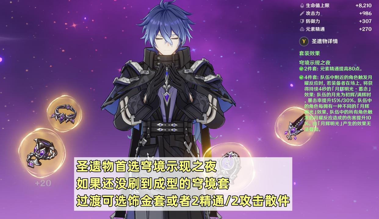 【圣遗物选择】套装首选这版本的新圣遗物“穹境示现之夜”,两件套加精通,四件套在满辉的情况下可以提供30%暴击率和10%月反应增伤。过渡可选饰金套或者2精通/2攻击散搭。