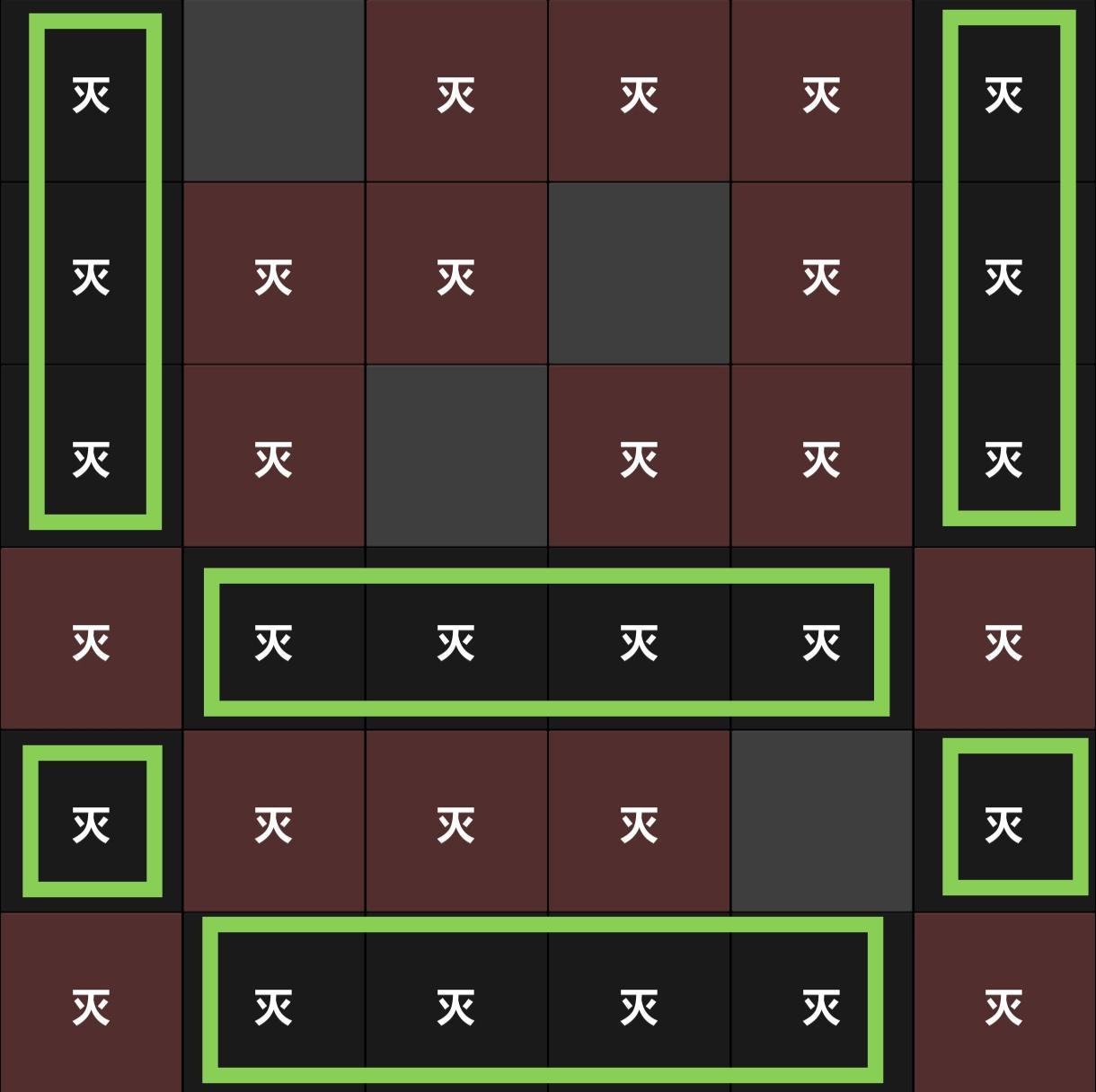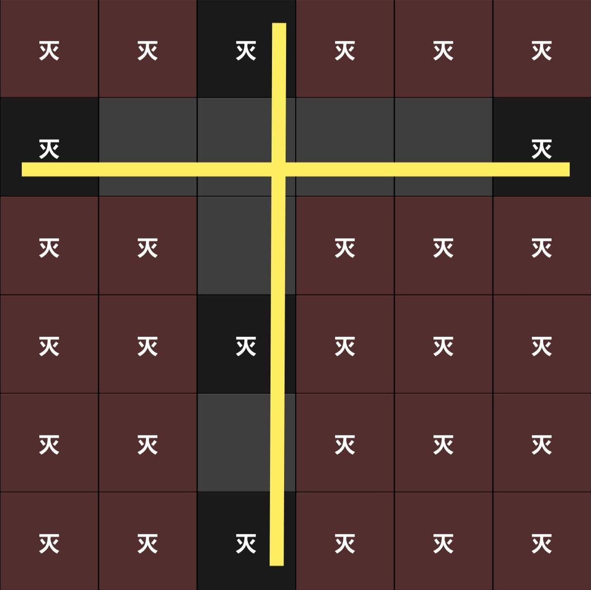 特点:两行/列的缺口为奇数且互补(1+5或3+3)。其它行/列为灯或缺口都不影响。