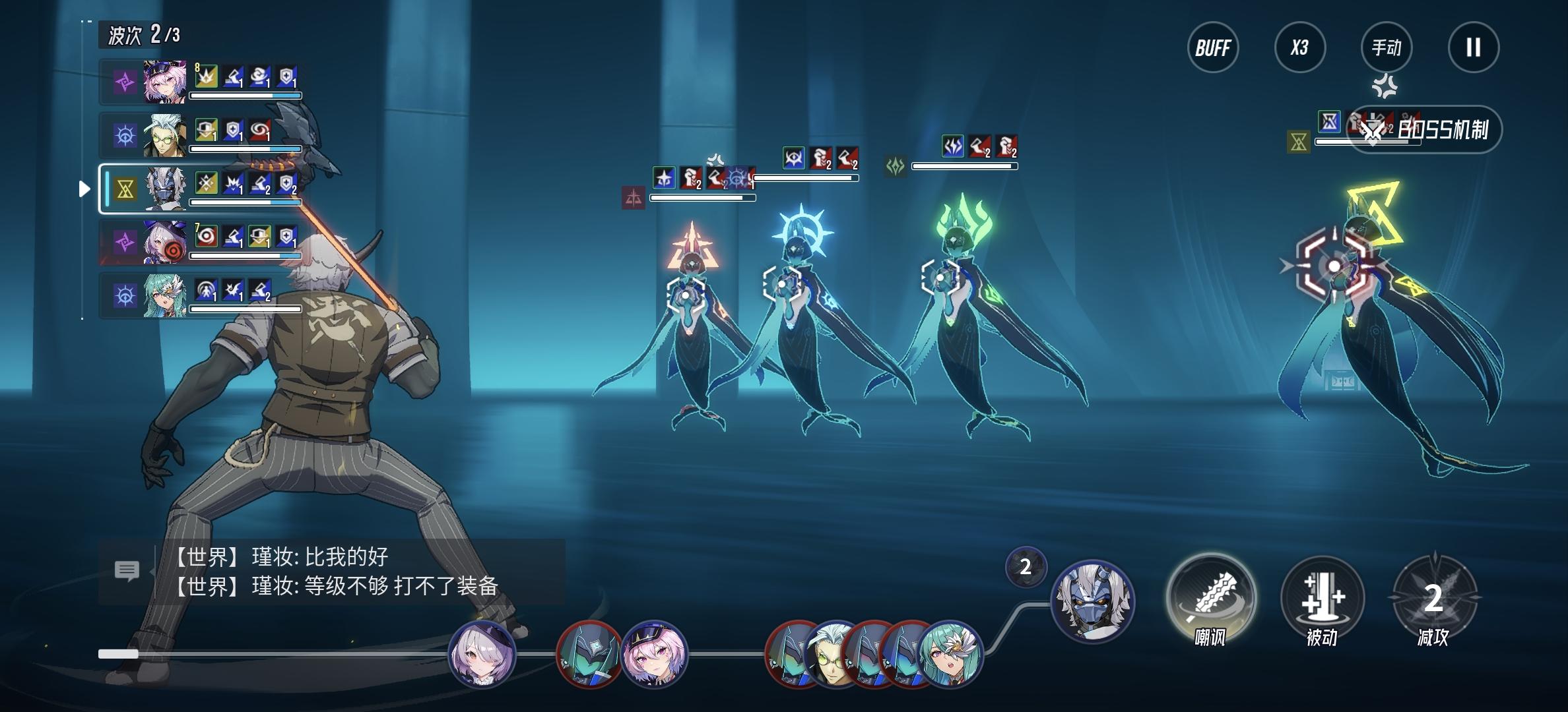 第一阶段的处理方式对于后续流程应对非常关键,先不断刷开局,不要暗怪(眩晕会影响节奏)这里我们优先拉起恶命嘲讽boss,第一回合嘲讽中了,就不断推条嘲讽,输出优先处理两边小怪,进去二阶段后保证队伍生存健康