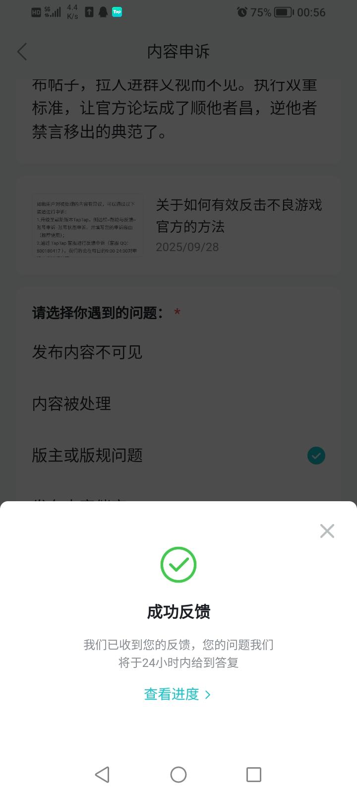 备注,这二天和我一样被禁言的玩家,账号被禁言申诉显示自身账号正常,但是就是被禁言了,填写了资料以后,也无法点击申诉。我已经试过了。可以在其他方面申诉以后,在反馈进度哪里,和tap官方进行补充说明。