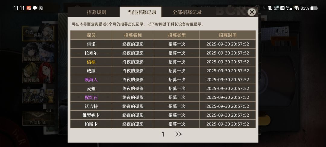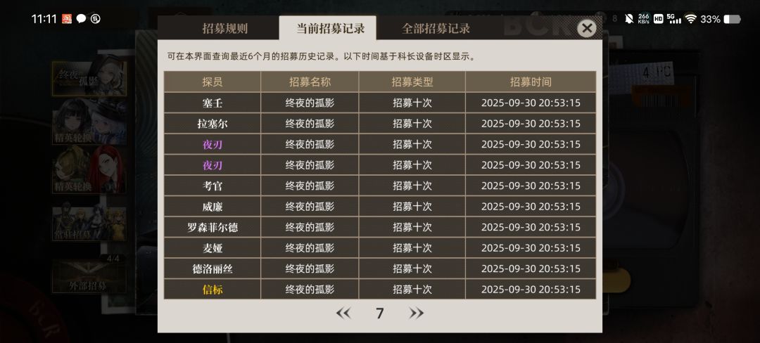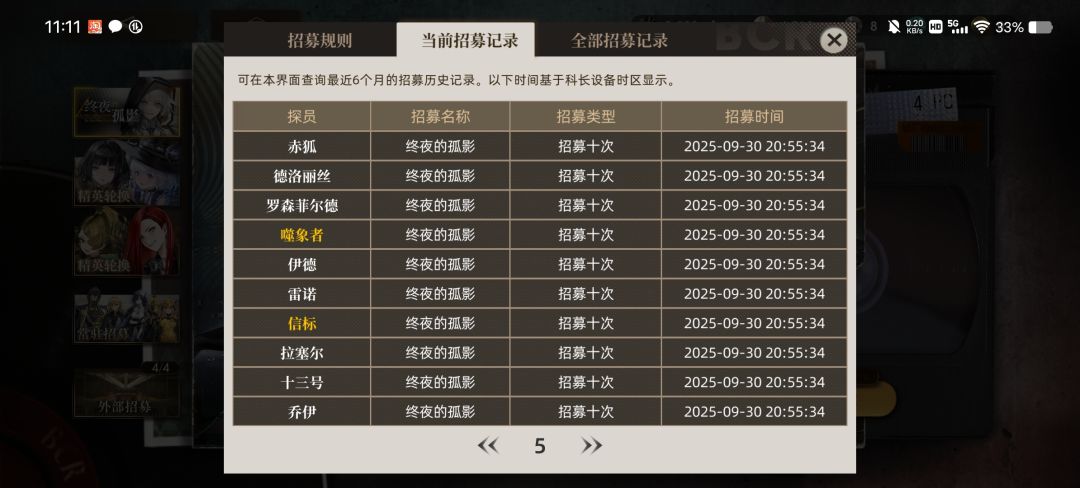 如图所示,限定池210抽共出六个六星(五个信标一个噬象者),符合异宝30到40抽出一个的抽卡数学期望,但其实还是算非的,因为第60抽才出信标