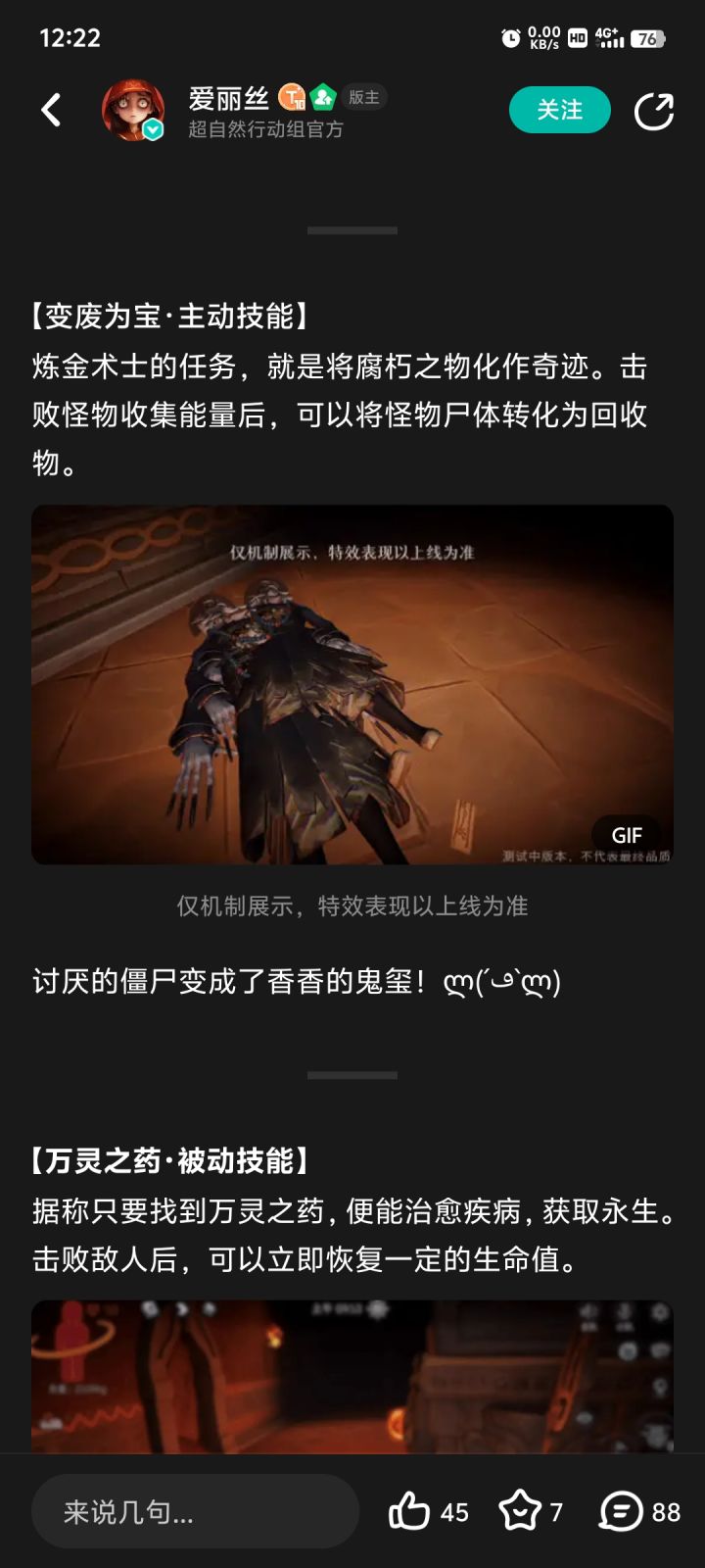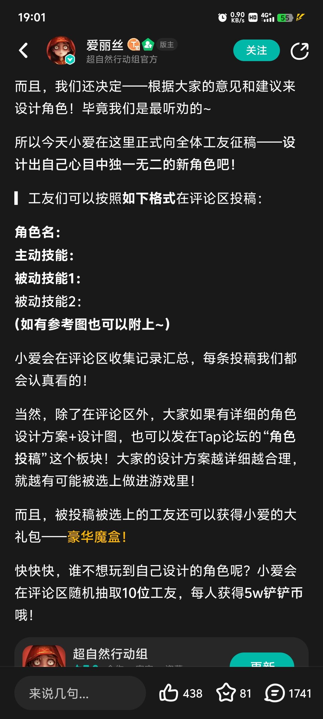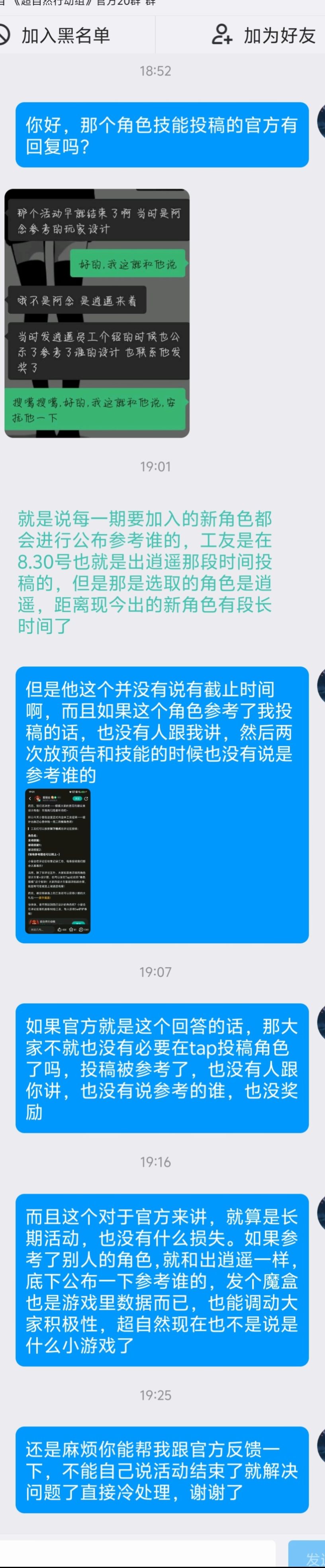 新角色的技能能看出来参考了我的投稿,我一直想着在群里跟管理或者官方联系,没在论坛上发,也没在其他短视频社交软件上发,是想着把这个事情解决掉。结果我在群里找管理半天都没人理我,最后终于有管理回我说问一下官方反馈一下,结果反馈了也没有官方的人跟我联系,管理也没回我。我又去找了管理才拿个截图就跟我说官方反馈这个活动已经结束了,但是tab上这个并没有标明截止时间,管理发了截图和一段话,我再跟他联系也没有回我。而且就算这个活动截止了按官方这意思就是说活动结束了,玩家的投稿可以随便用,也不需要跟玩家讲,也不需要标明是不是参考了玩家的投稿,只要不讲就是全都是他自己想的。我不知道官方怎么想的,这么小一个事情好几天了都没有解决,非常的不尊重人,不知道是不是他们有一种傲慢,觉得我连致命公司和第五人格我都能抄,何况你一个小小的玩家,大概率你还是个小学生,你能翻起什么了浪。我玩很多别的游戏也给官方提供过建议,没有哪个游戏,官方说用了你的建议和投稿跟你都不讲一声。真的第一次碰到这种官方,非常的让人恼火。也不是说我非要这个奖励 ,一个魔盒几十块钱的东西,我在其他很多游戏都是充完钱买完皮肤或者通行证,没玩几天我就卸载不玩了,也不说什么。但是官方这个态度我真是非常不爽,就你这一个月挣这么多,随便出个皮肤就是几百块几百块的,比王者做的贵多了。我也不相信说赚这么多钱的游戏节假日连个运营都没有,一直不回应,一直冷处理就能解决问题吗?新角色公布也没有标明参考了我的投稿,你也不跟我联系,也不标明参考了投稿,如果活动结束了,那你就不要参考我的技能,我也就当发个角色投稿来给大家看个高兴。#超自然行动组角色投稿 #浅评一下