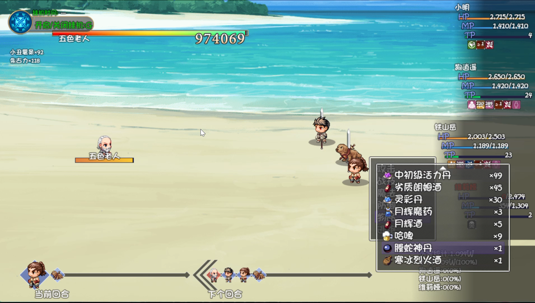如图,在五色老人出现后继续选择击杀,携带“霸王举鼎功”的人抗下伤害,第二回合自动结束战斗