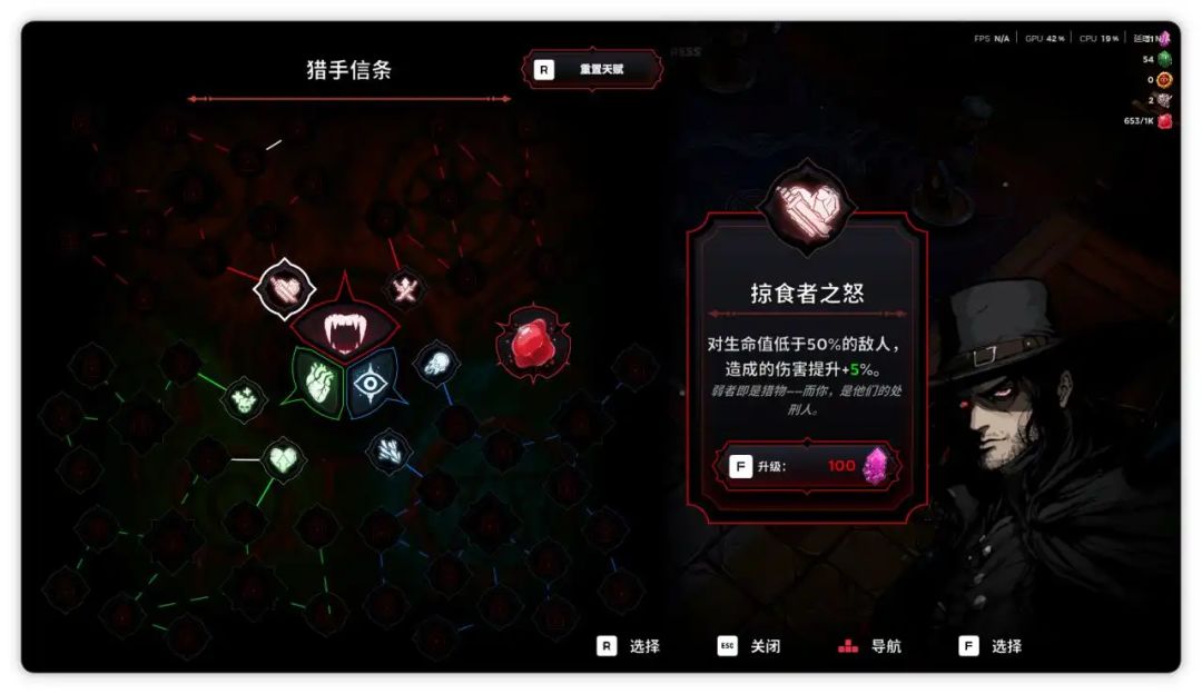 而局外成长系统则允许玩家消耗黄金、紫色精华等资源永久升级天赋,比如"猎手信条"天赋树中专注提升伤害的"掠食者之怒"以及可以选择“冰霜”或者“火焰”伤害等截然不同的流派,进一步强化了角色的战斗特性。