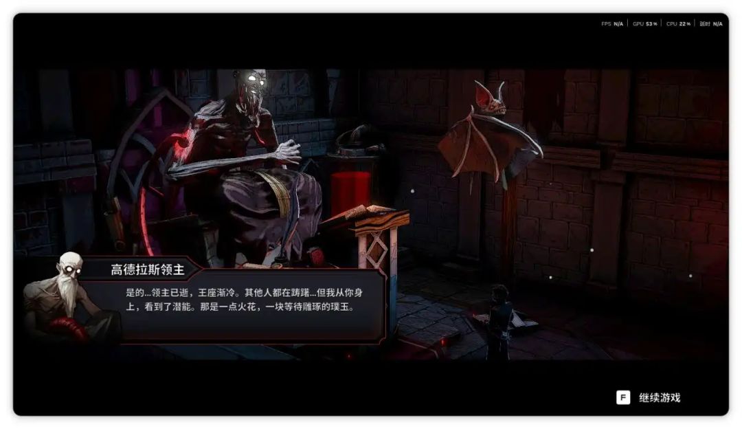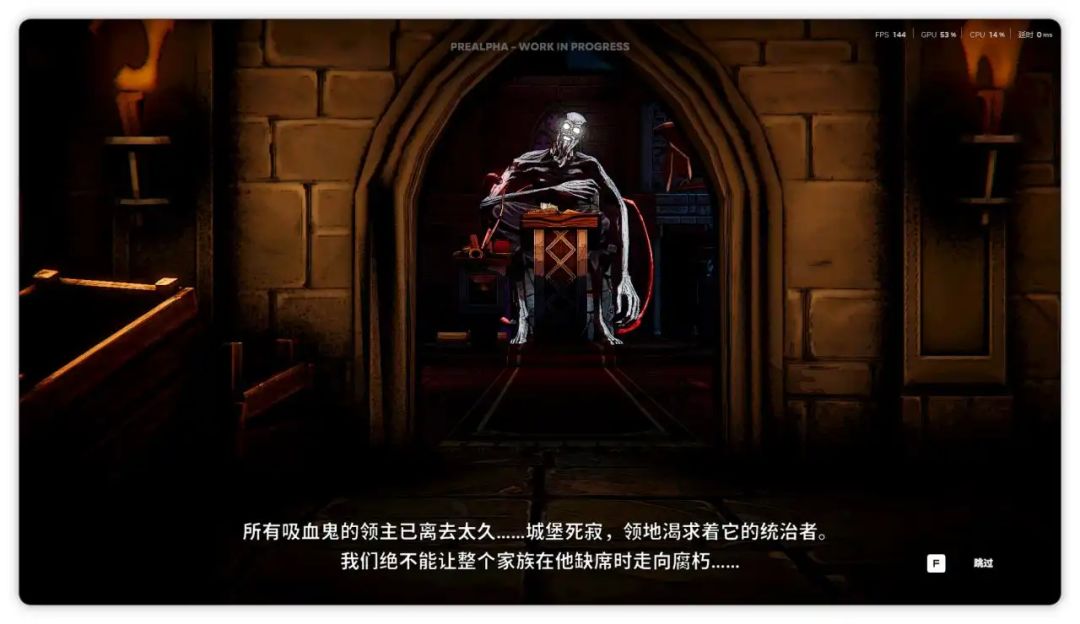 游戏的美术风格堪称一绝,完美诠释了"哥特式暗黑"的精髓。从高耸的尖塔城堡到斑驳的石墙纹理,从燃烧的壁灯到暗红色的地毯,每一处场景细节都散发着中世纪吸血鬼传说的神秘气息。主视觉中的高德拉斯领主设计尤为惊艳,惨白皮肤下突出的骨骼轮廓、深陷的眼窝与尖锐的牙齿,配合破烂深色长袍与红色装饰边缘,将恐怖与优雅诡异融合。
