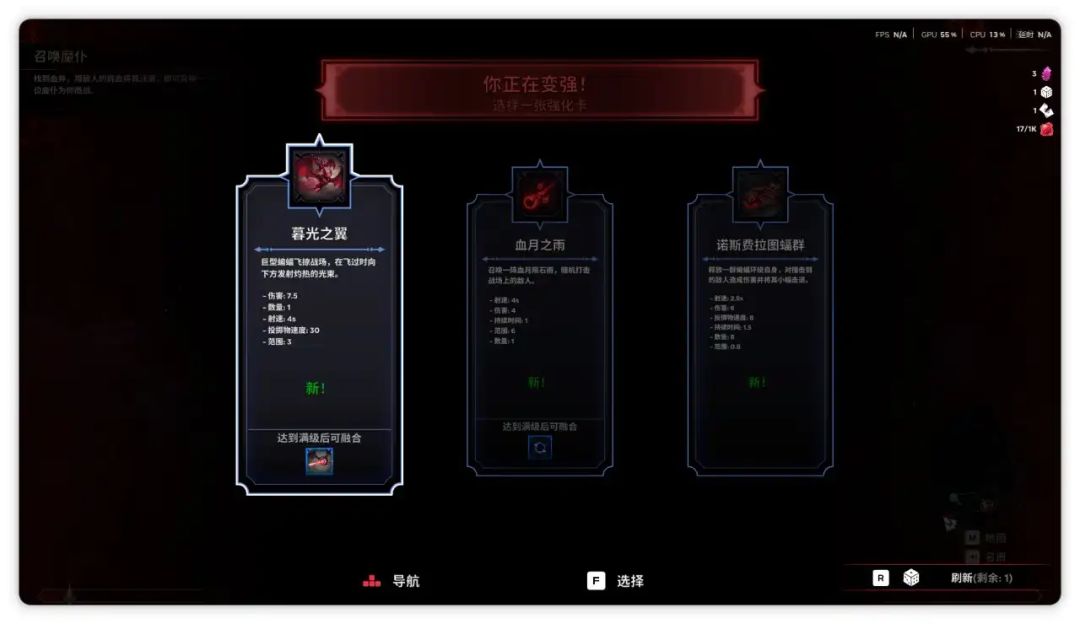 游戏在玩法上兼具爽快感与策略性。玩家可挥动噬血镰刀释放致命攻击,通过自由组合主动技能与被动加成,构建属于自己的"杀戮流派"。强化卡系统提供了丰富的技能选择。