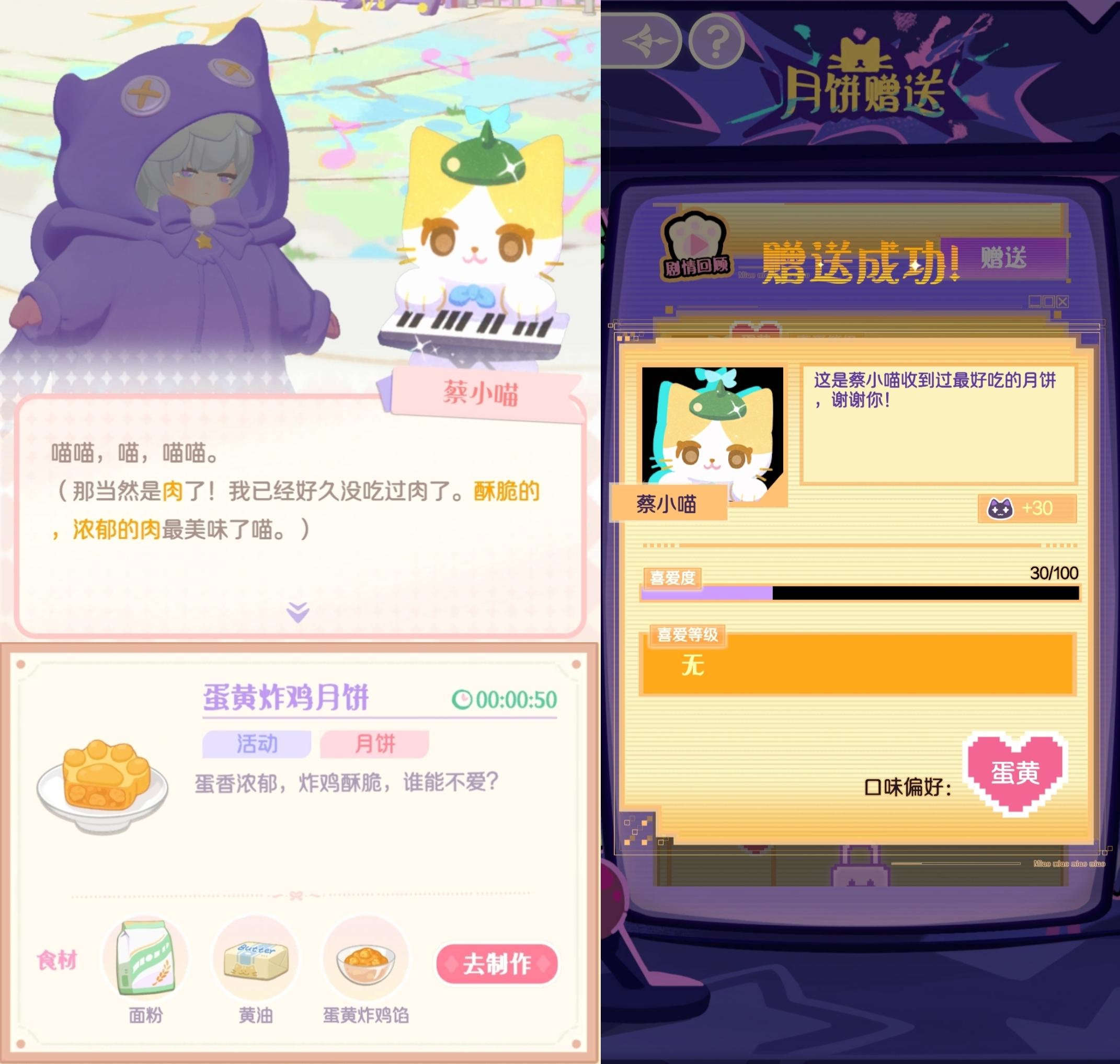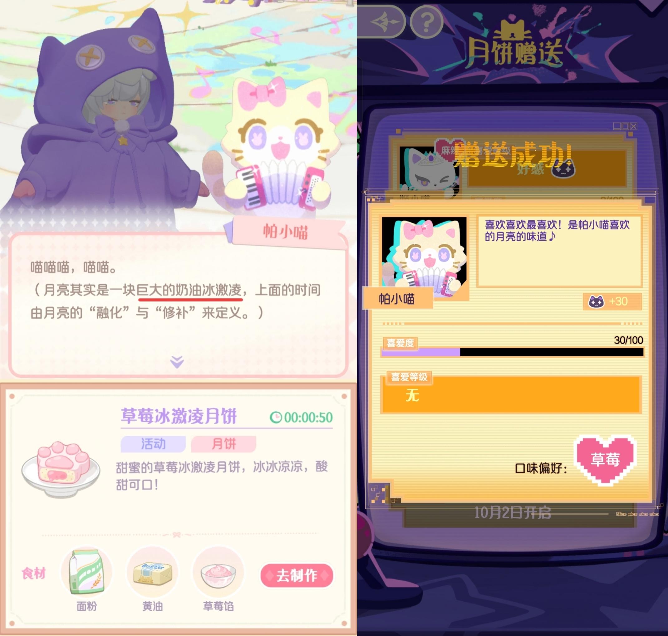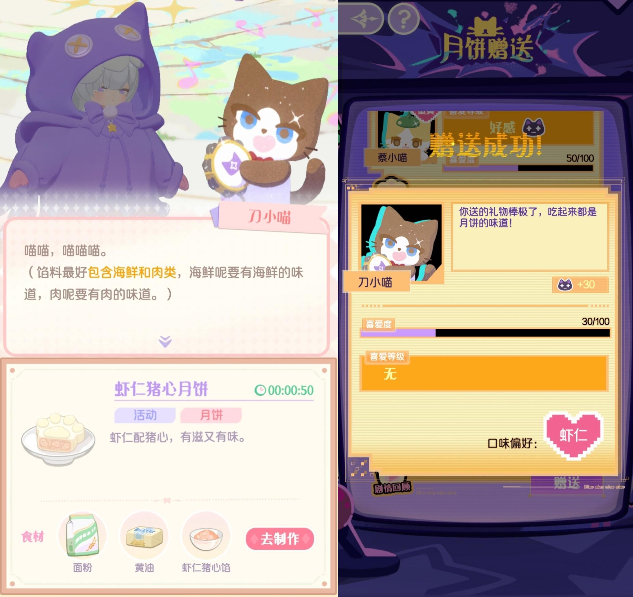 3.送礼:活动共有六只猫猫,推测六种月饼对应六只不同的猫猫,根据对话判断出喜欢的月饼后存着其他月饼等解锁,只送喜欢的月饼即可。