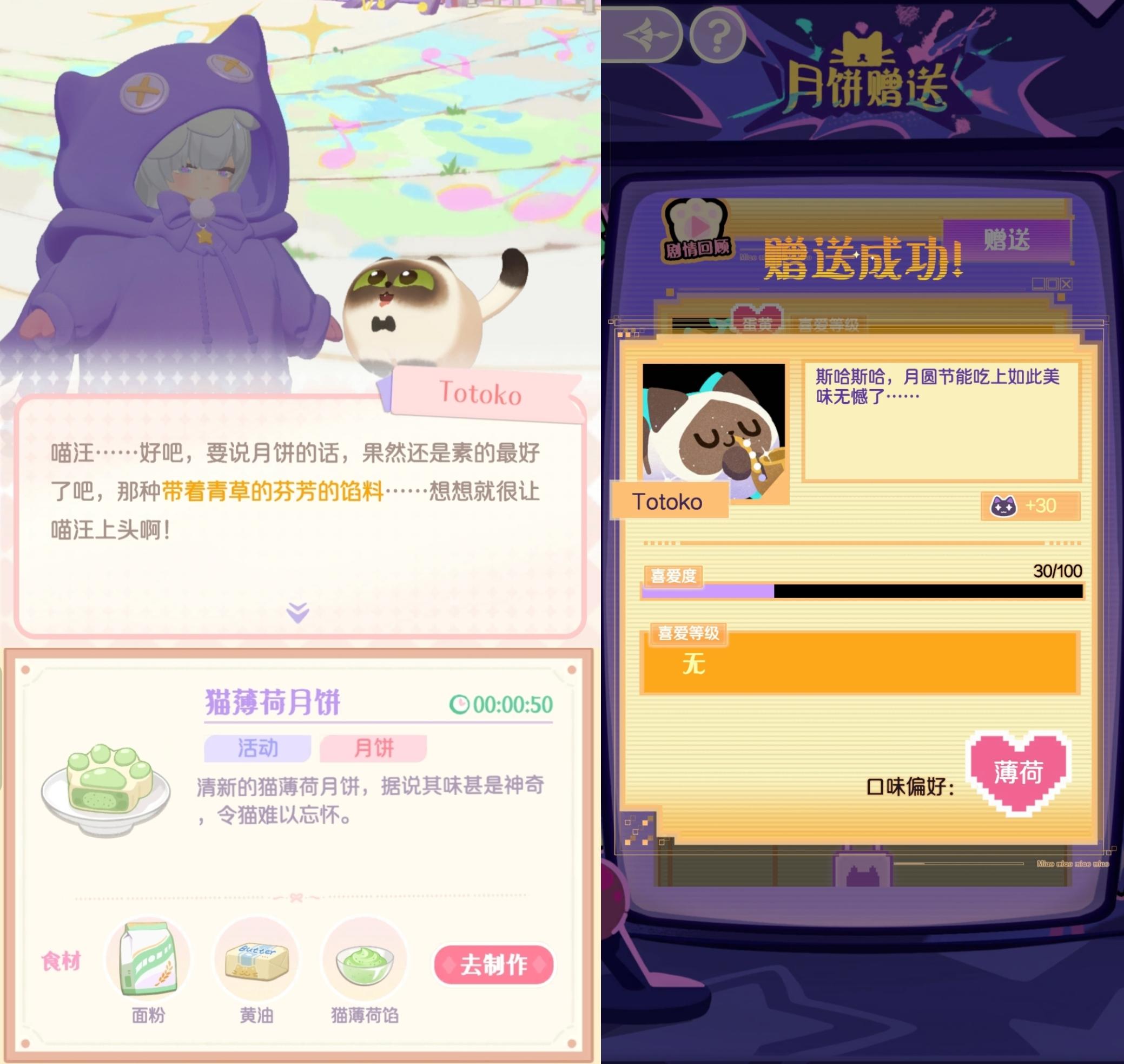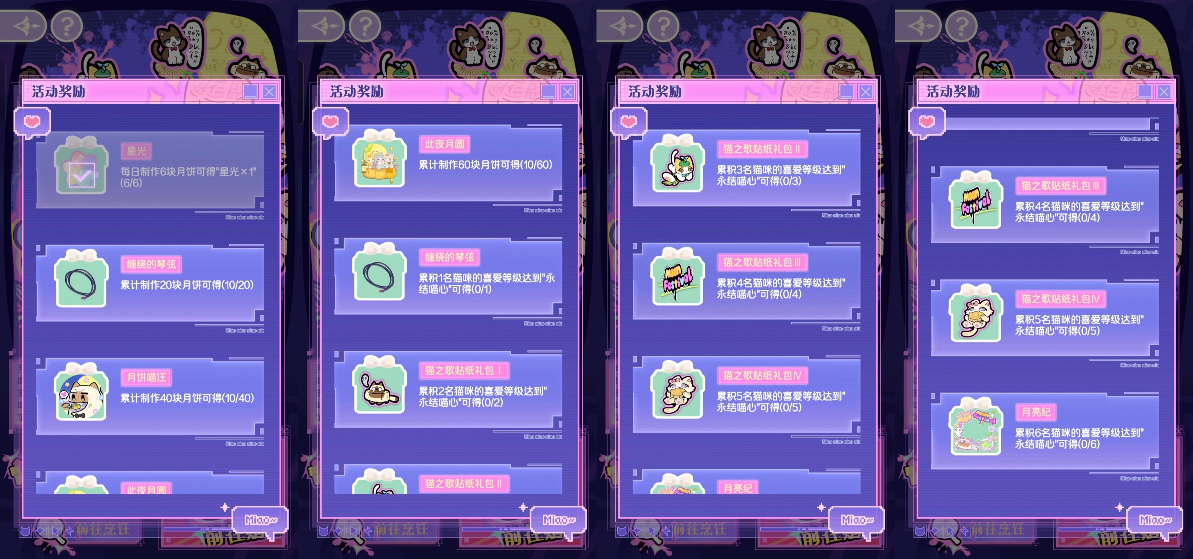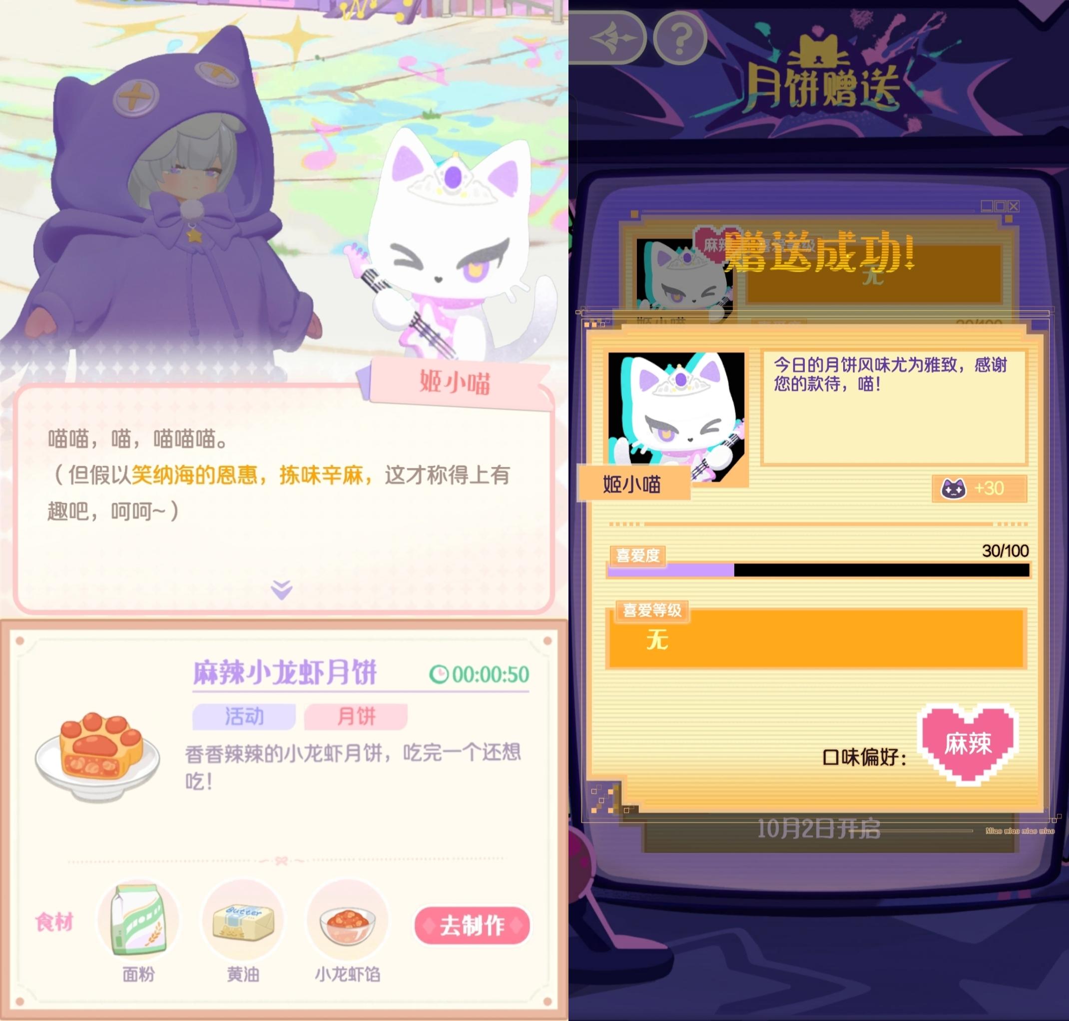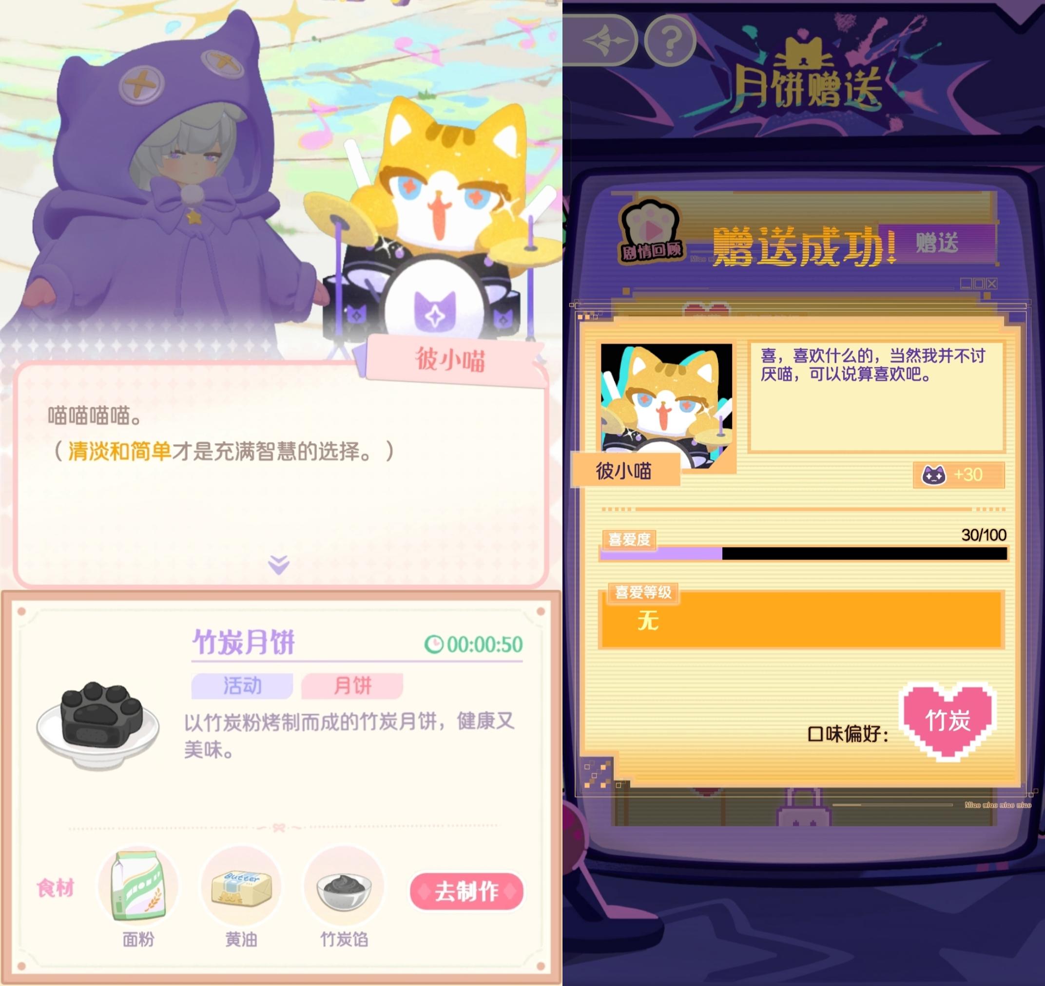 活动流程:获取材料→烹饪月饼→赠送猫咪,提升喜爱度→完成成就,获取奖励