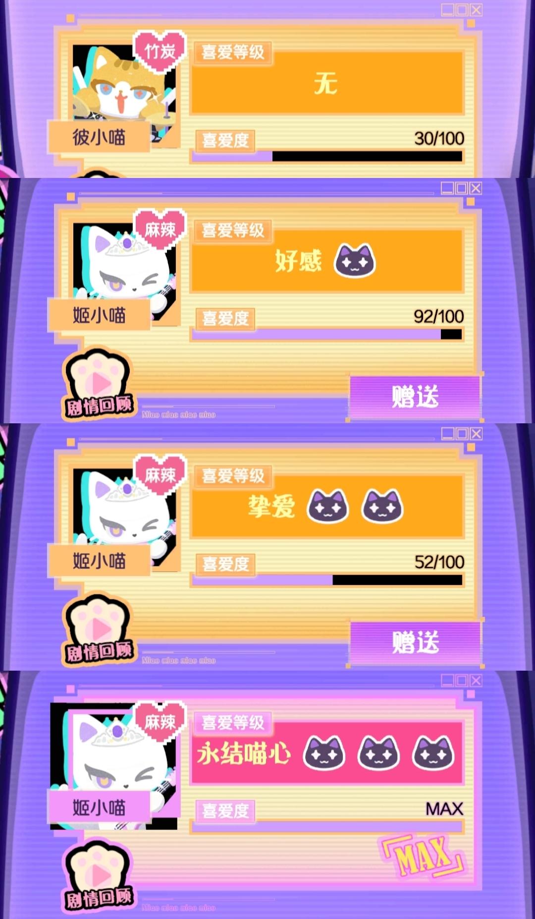 ②喜爱度:赠送月饼一般的+12喜爱度,喜欢的+30喜爱度,满好感需要300(无→好感:100;好感→挚爱:100;挚爱→永结喵心:100)