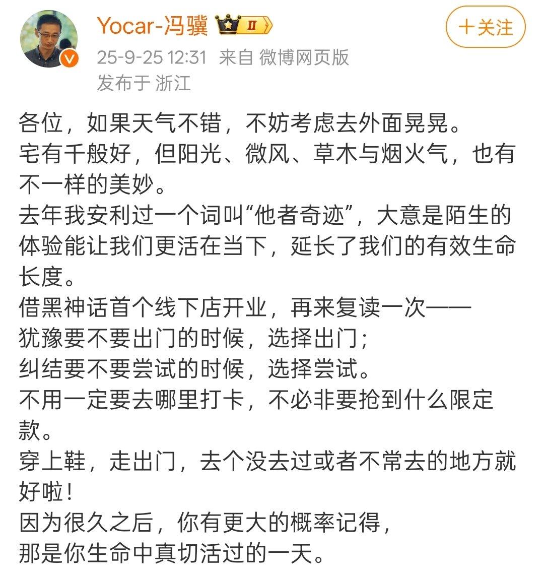 各位,如果天气不错,不妨考虑去外面晃晃。宅有千般好,但阳光、微风、草木与烟火气,也有不一样的美妙。去年我安利过一个词叫“他者奇迹”,大意是陌生的体验能让我们更活在当下,延长了我们的有效生命长度。借黑神话首个线下店开业,再来复读一次——犹豫要不要出门的时候,选择出门;纠结要不要尝试的时候,选择尝试。不用一定要去哪里打卡,不必非要抢到什么限定款。穿上鞋,走出门,去个没去过或者不常去的地方就好啦!因为很久之后,你有更大的概率记得,那是你生命中真切活过的一天。
