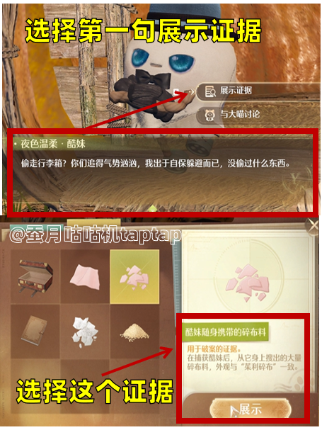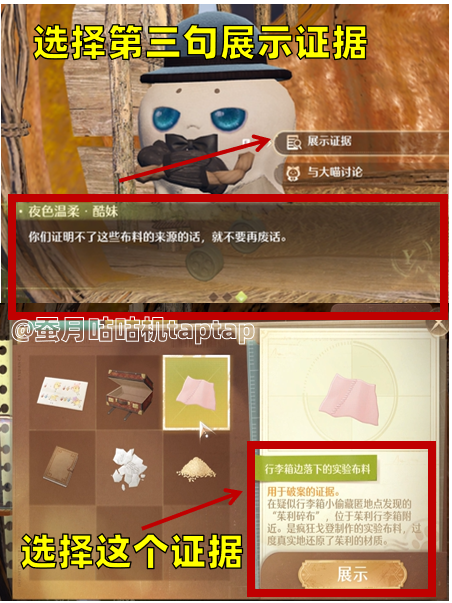 ⭕审讯酷妹:分别选择第一句第三句第二句➡️证据对应是“酷妹随身携带的碎布料”“行李箱边落下的实验布料” “疤尼的随笔残页”
