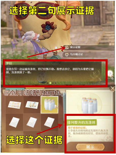 ⭕模拟审讯萝拉:选择第二句展示证据➡️证据是“排列整齐的洗涤剂”