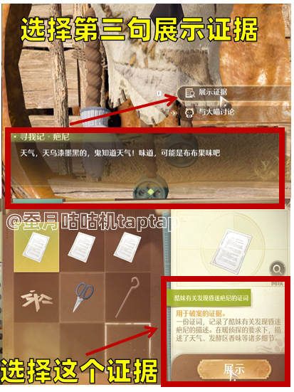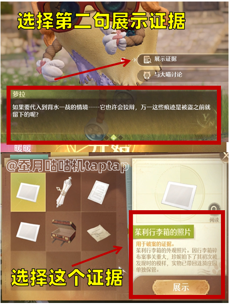 ⭕最后一次模拟审讯萝拉:分别选择第一句第三句第二句➡️证据对应是“打开的茱莉的行李箱”“果果超果果的妙妙配方”“茱莉行李箱的照片”