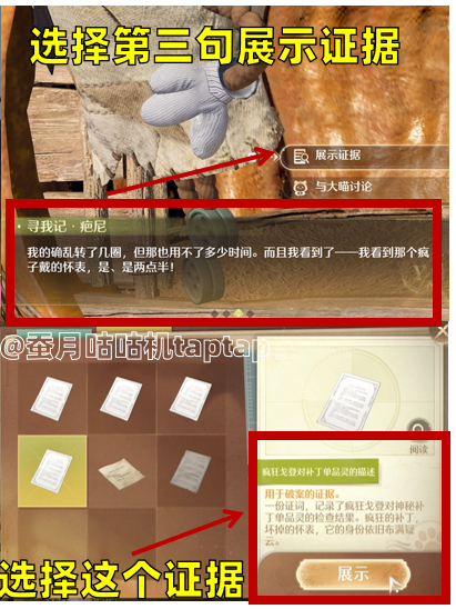 ⭕再次审讯疤尼:两次都是选择第三句➡️证据分别是“酷妹有关发现昏迷疤尼的证词”“疯狂戈登对补丁单品灵的描述”